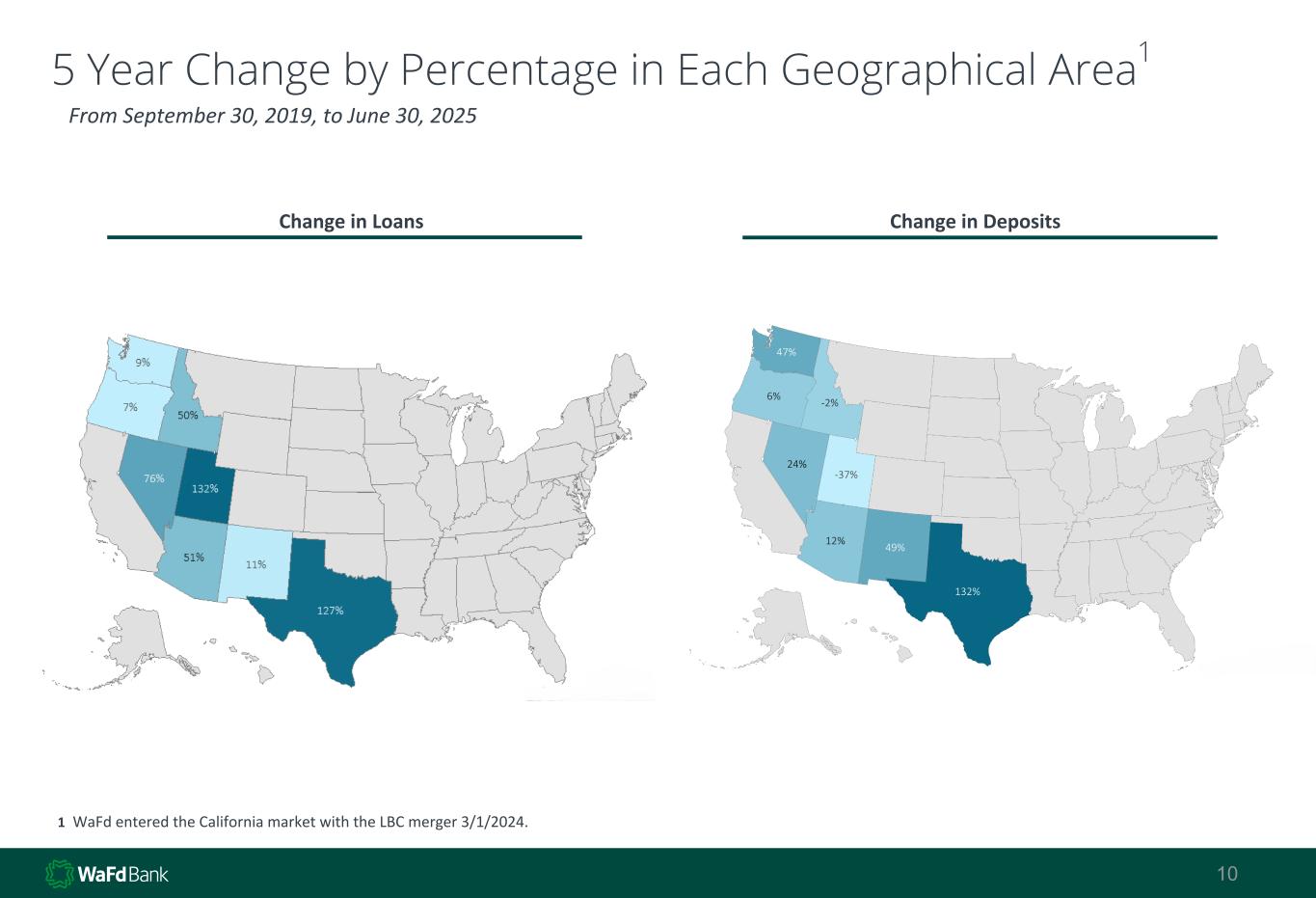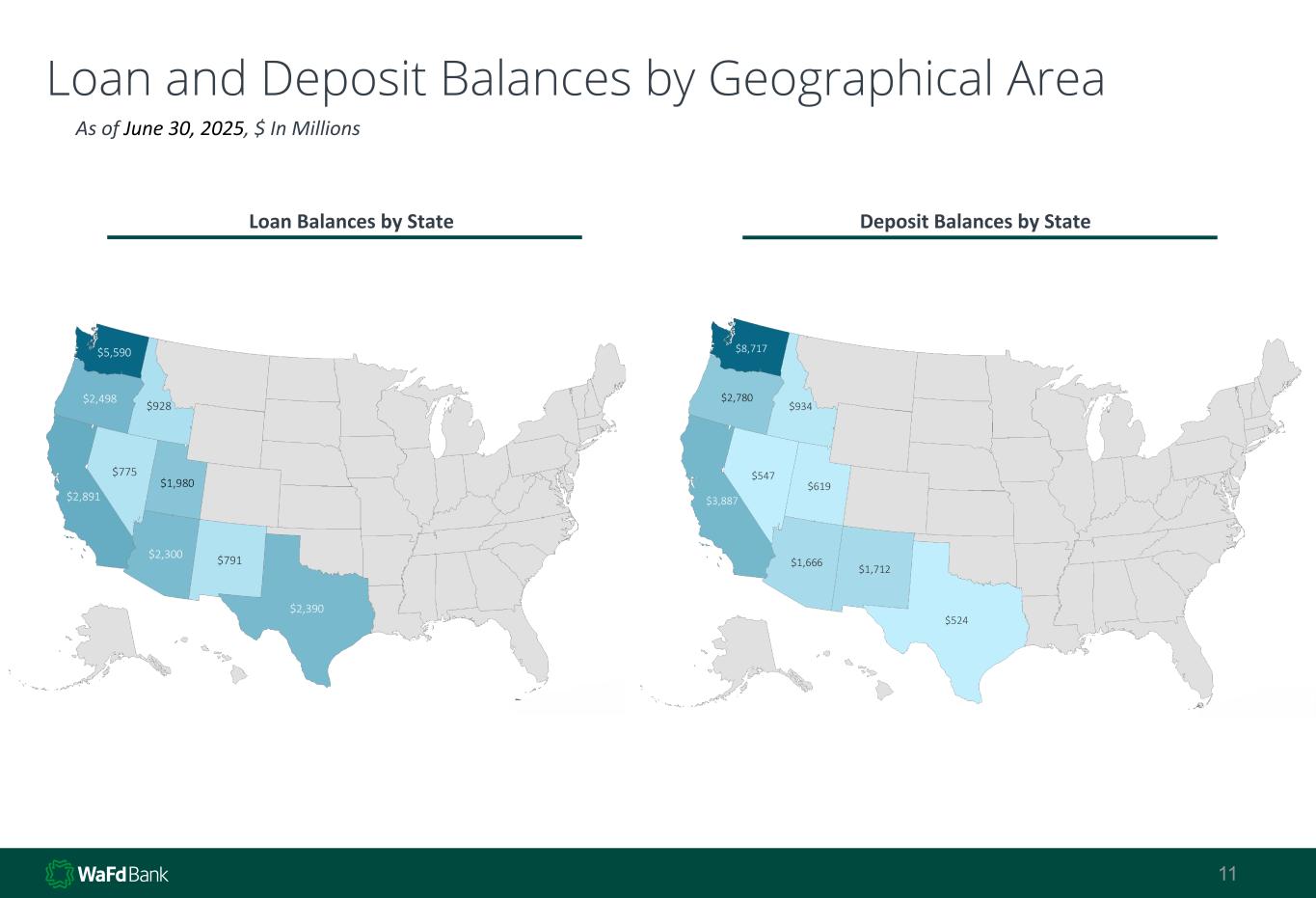 10 5 Year Change by Percentage in Each Geographical Area1 From September 30, 2019, to June 30, 2025 1 WaFd entered the California market with the LBC merger 3/1/2024. Change in Loans Change in Deposits