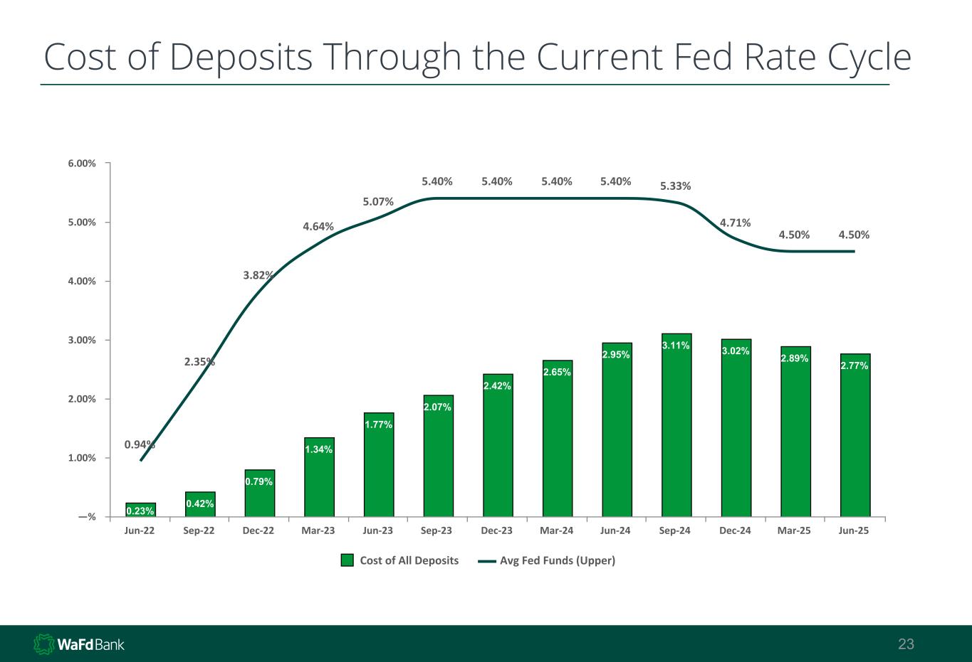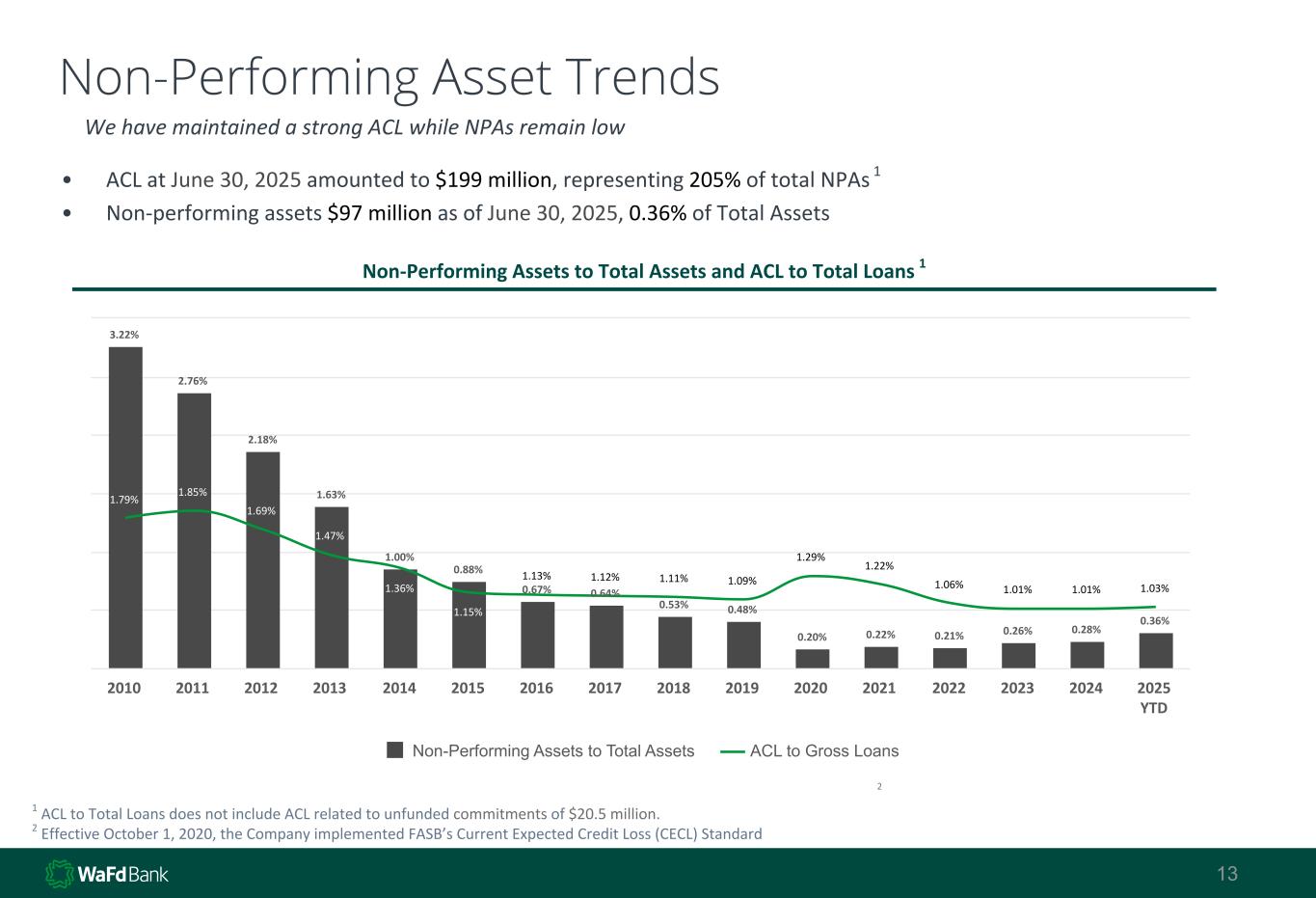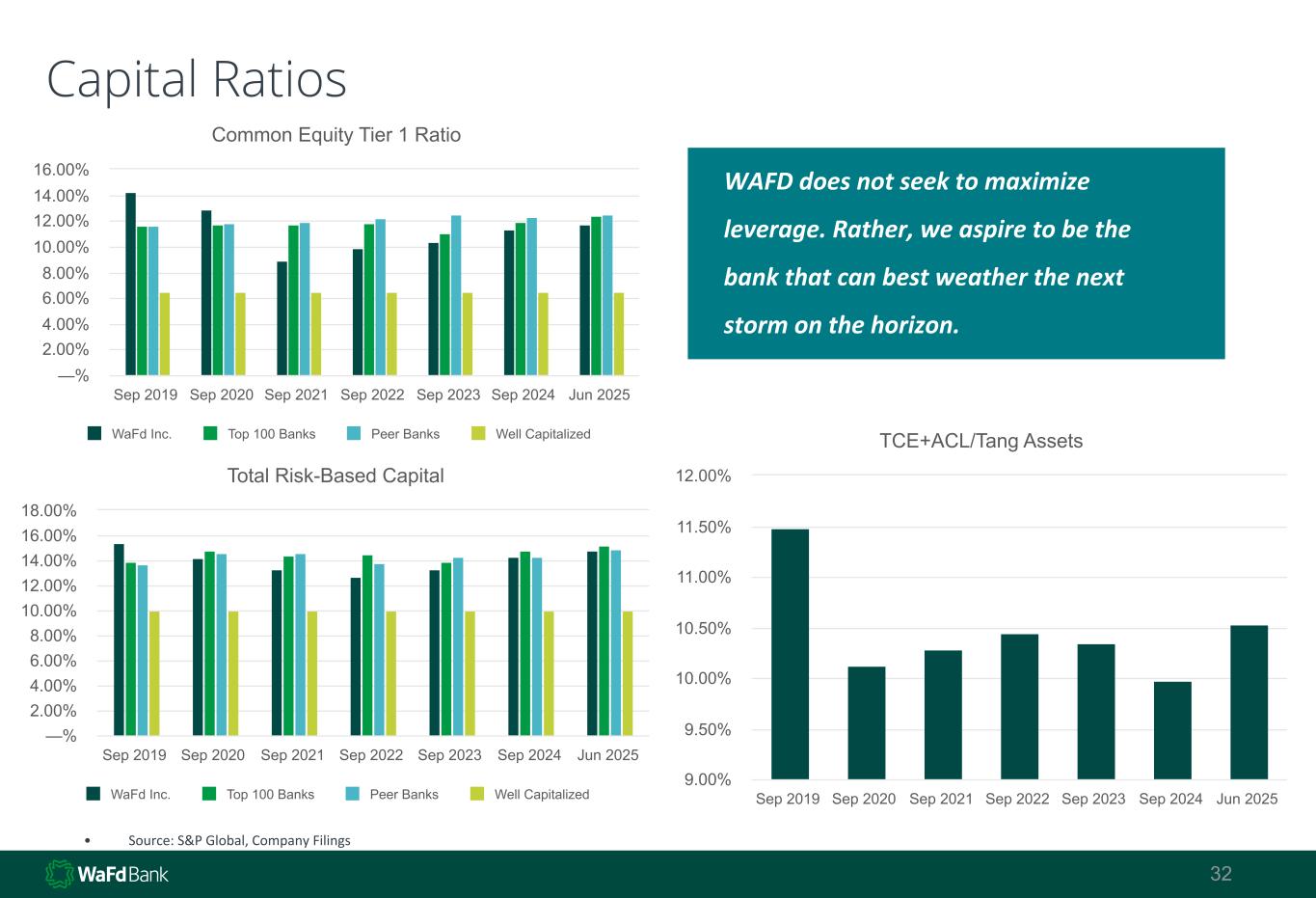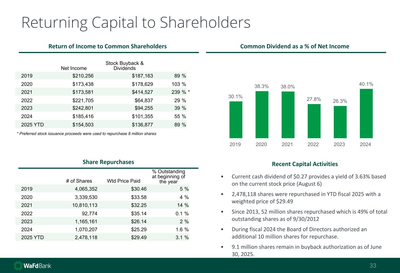 32 Capital Ratios WAFD does not seek to maximize leverage. Rather, we aspire to be the bank that can best weather the next storm on the horizon. • Source: S&P Global, Company Filings Common Equity Tier 1 Ratio WaFd Inc. Top 100 Banks Peer Banks Well Capitalized Sep 2019 Sep 2020 Sep 2021 Sep 2022 Sep 2023 Sep 2024 Jun 2025 —% 2.00% 4.00% 6.00% 8.00% 10.00% 12.00% 14.00% 16.00% Total Risk-Based Capital WaFd Inc. Top 100 Banks Peer Banks Well Capitalized Sep 2019 Sep 2020 Sep 2021 Sep 2022 Sep 2023 Sep 2024 Jun 2025 —% 2.00% 4.00% 6.00% 8.00% 10.00% 12.00% 14.00% 16.00% 18.00% TCE+ACL/Tang Assets Sep 2019 Sep 2020 Sep 2021 Sep 2022 Sep 2023 Sep 2024 Jun 2025 9.00% 9.50% 10.00% 10.50% 11.00% 11.50% 12.00%