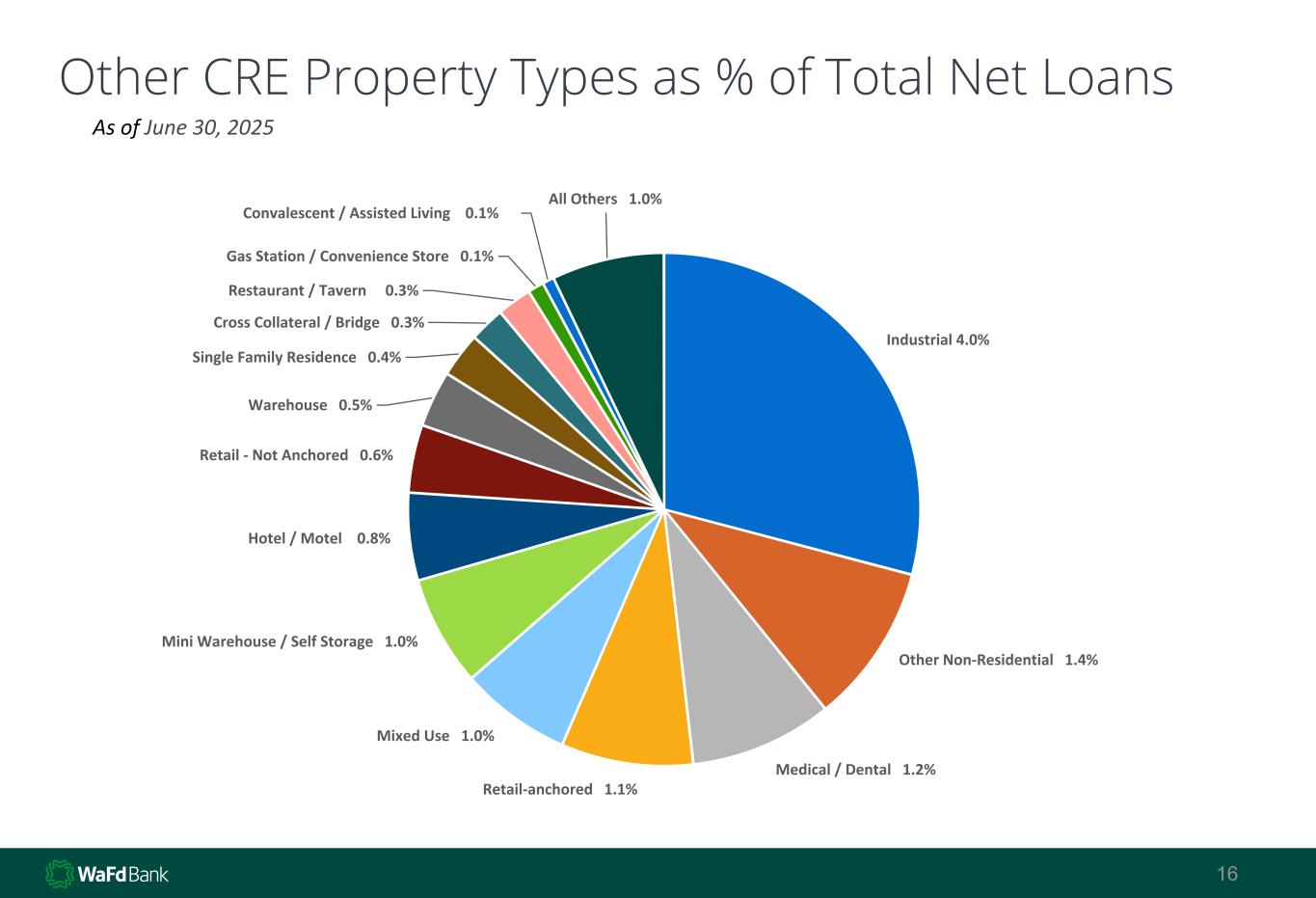 Net Loan Portfolio Average Current LTV 15 As of June 30, 2025, $ In Thousands Net Balance % of Loans WTD Avg Current LTV % Delinquent based on $ Multifamily 4,753,223 23 % 56 % 0.20 % CRE - Office 794,737 4 % 73 % 0.60 % CRE - Other 2,755,382 14 % 48 % — % CRE Construction - Multifamily 594,116 3 % 57 % — % CRE Construction - Other 424,472 2 % 46 % — % C&I 2,235,310 11 % NA 0.04 % SFR 8,068,150 40 % 48 % 0.43 % SFR Custom Construction 94,625 — % 79 % 0.90 % Other 557,149 3 % NA 0.51 % 20,277,164 100 % 0.27 %