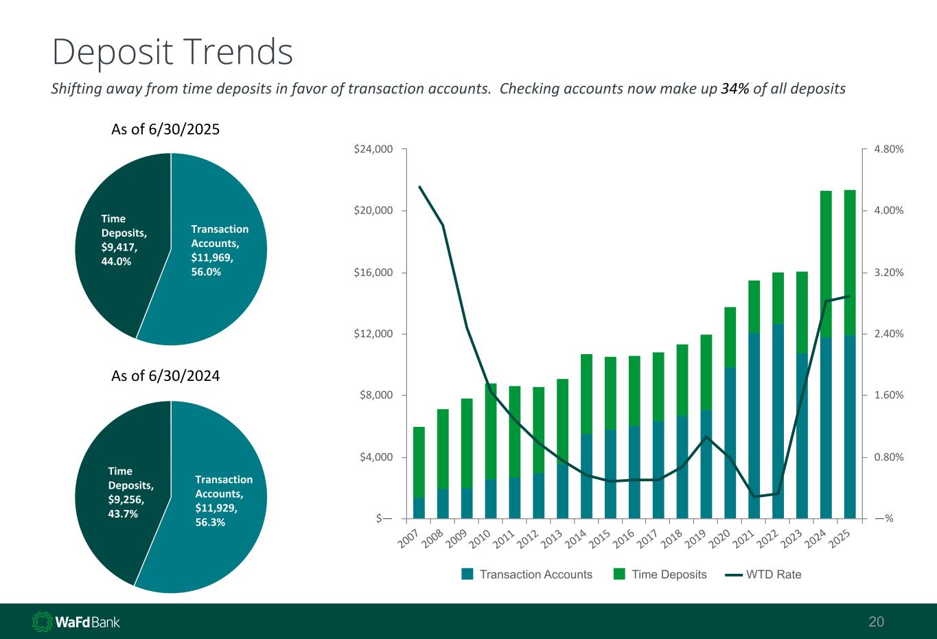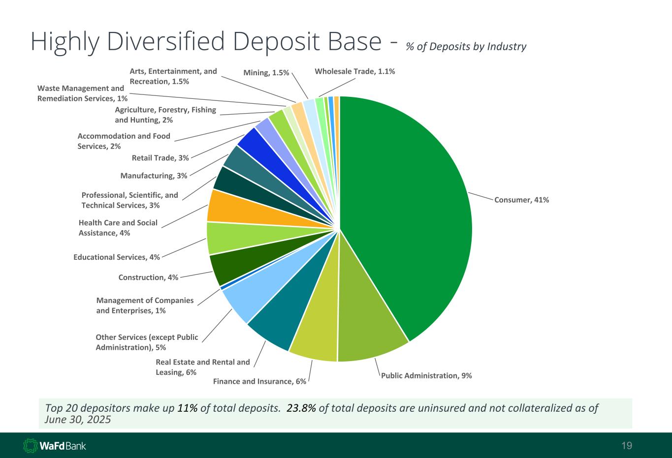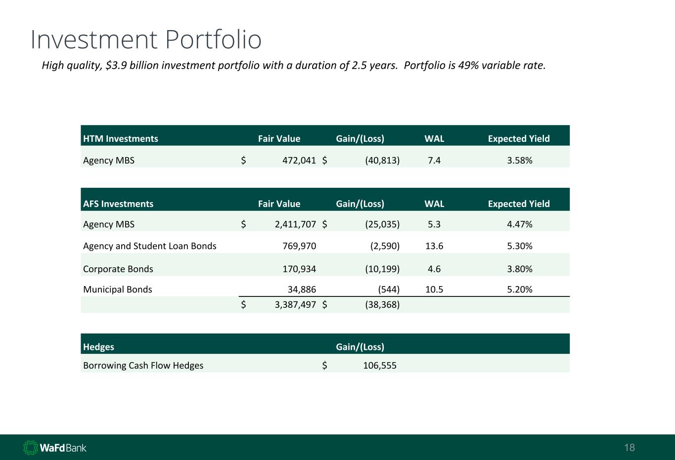 Significant Liquidity and High-Quality Securities Portfolio 17 High quality, $4.7 billion cash and investment portfolio with $14.8 billion remaining collateral and lines as a source of additional potential liquidity Cash and Securities Composition Total Cash and Securities: $4.7B Cash and Securities / Total Assets: 18% Cash & Securities / Total Assets1 As of 6/30/2025, WAFD maintains $4.7 of balance sheet Liquidity. • Cash and Securities is 18% of assets • Investment Portfolio targets low credit risk / moderate duration • 79% Cash and US Government-backed Agency Bonds and MBS • Current Yield on Cash and Investments Portfolio is 4.24% Liquidity is tested quarterly through utilizing various scenarios to determine their affect on available liquidity. Whether minor or extreme, these tests show strong liquidity as a result of deposits and borrowing capacity from reliable collateralized sources. Source: SNL Financial, Company Filings 1 Peers represent Banks similar to WaFd in size, geography and operations Total Cash and Securities: $5.4B Cash and Securities / Total Assets: 19% 6/30/2024 6/30/2025 US Backed, 62% Cash, 17% High Quality Bonds, 21% US Backed, 34% Cash, 46% High Quality Bonds, 20% WAFD Peers Sep 2018 Sep 2019 Sep 2020 Sep 2021 Sep 2022 Sep 2023 Sep 2024 10.00% 20.00% 30.00% 40.00%