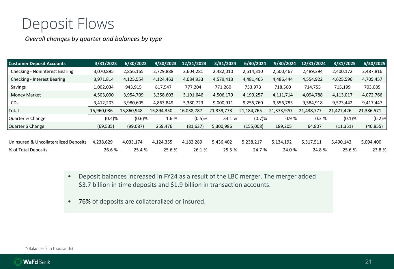20 Deposit Trends Shifting away from time deposits in favor of transaction accounts. Checking accounts now make up 34% of all deposits Transaction Accounts, $11,969, 56.0% Time Deposits, $9,417, 44.0% Transaction Accounts, $11,929, 56.3% Time Deposits, $9,256, 43.7% As of 6/30/2025 As of 6/30/2024 Transaction Accounts Time Deposits WTD Rate 20 07 20 08 20 09 20 10 20 11 20 12 20 13 20 14 20 15 20 16 20 17 20 18 20 19 20 20 20 21 20 22 20 23 20 24 20 25 $— $4,000 $8,000 $12,000 $16,000 $20,000 $24,000 —% 0.80% 1.60% 2.40% 3.20% 4.00% 4.80%