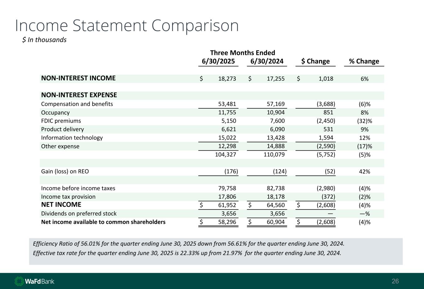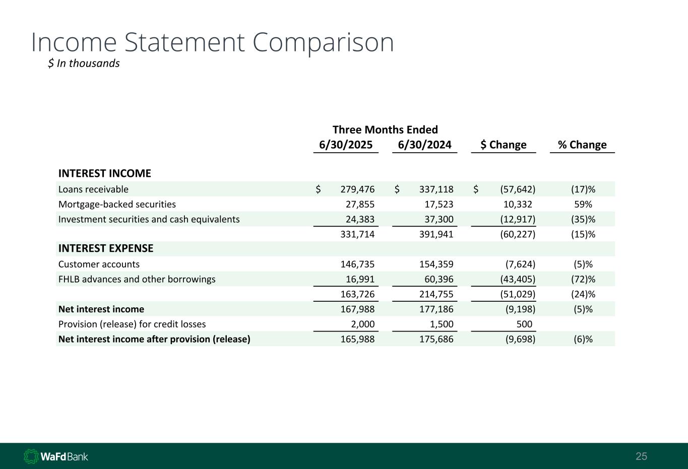 25 Income Statement Comparison 25 $ In thousands Three Months Ended 6/30/2025 6/30/2024 $ Change % Change INTEREST INCOME Loans receivable $ 279,476 $ 337,118 $ (57,642) (17)% Mortgage-backed securities 27,855 17,523 10,332 59% Investment securities and cash equivalents 24,383 37,300 (12,917) (35)% 331,714 391,941 (60,227) (15)% INTEREST EXPENSE Customer accounts 146,735 154,359 (7,624) (5)% FHLB advances and other borrowings 16,991 60,396 (43,405) (72)% 163,726 214,755 (51,029) (24)% Net interest income 167,988 177,186 (9,198) (5)% Provision (release) for credit losses 2,000 1,500 500 Net interest income after provision (release) 165,988 175,686 (9,698) (6)%