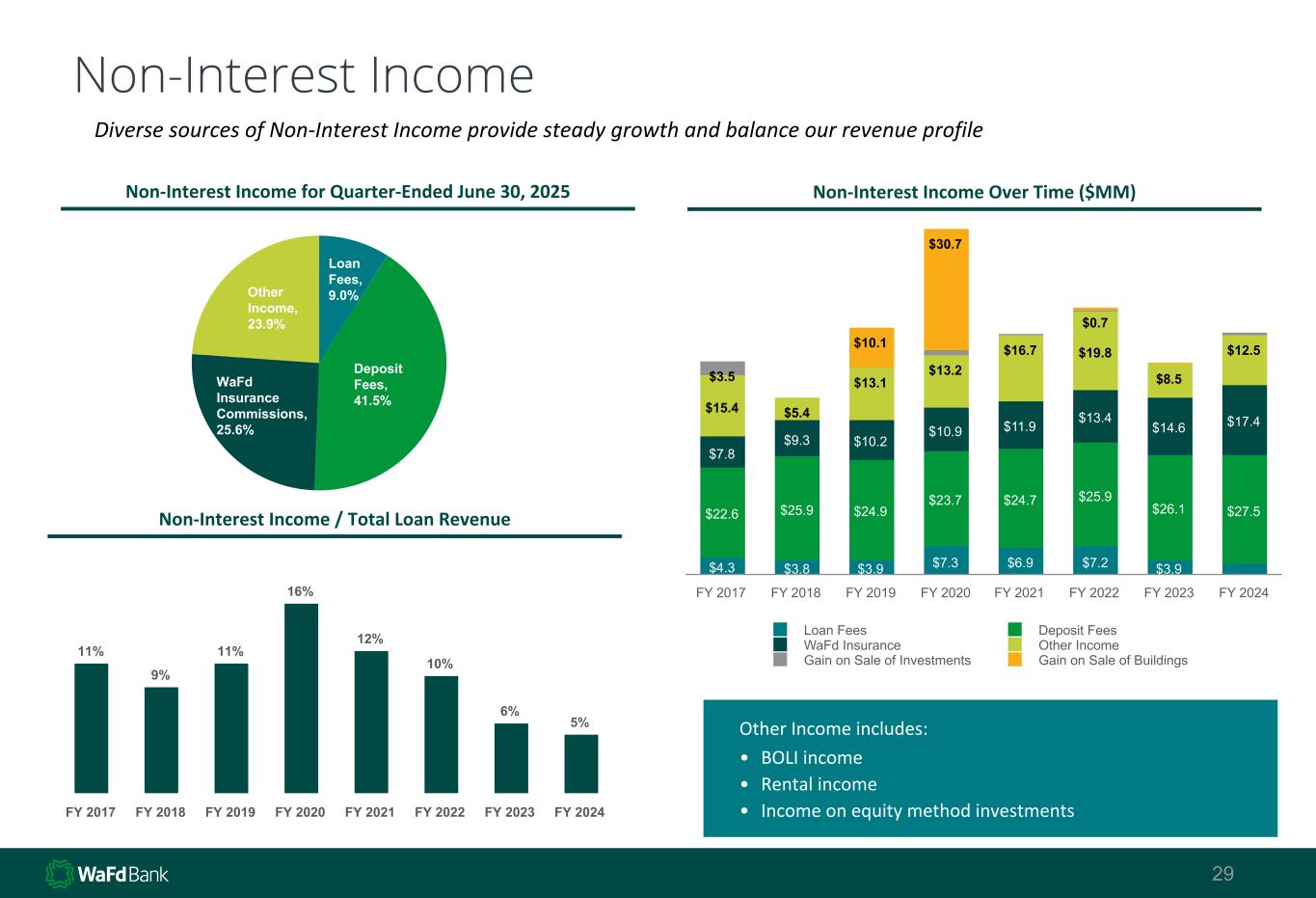 Non-Interest Income 29 Diverse sources of Non-Interest Income provide steady growth and balance our revenue profile Non-Interest Income for Quarter-Ended June 30, 2025 Non-Interest Income Over Time ($MM) Non-Interest Income / Total Loan Revenue Other Income includes: • BOLI income • Rental income • Income on equity method investments Loan Fees, 9.0% Deposit Fees, 41.5% WaFd Insurance Commissions, 25.6% Other Income, 23.9% 11% 9% 11% 16% 12% 10% 6% 5% FY 2017 FY 2018 FY 2019 FY 2020 FY 2021 FY 2022 FY 2023 FY 2024 $4.3 $3.8 $3.9 $7.3 $6.9 $7.2 $3.9 $22.6 $25.9 $24.9 $23.7 $24.7 $25.9 $26.1 $27.5 $7.8 $9.3 $10.2 $10.9 $11.9 $13.4 $14.6 $17.4 $15.4 $5.4 $13.1 $13.2 $16.7 $19.8 $8.5 $12.5 $3.5 $10.1 $30.7 $0.7 Loan Fees Deposit Fees WaFd Insurance Other Income Gain on Sale of Investments Gain on Sale of Buildings FY 2017 FY 2018 FY 2019 FY 2020 FY 2021 FY 2022 FY 2023 FY 2024
