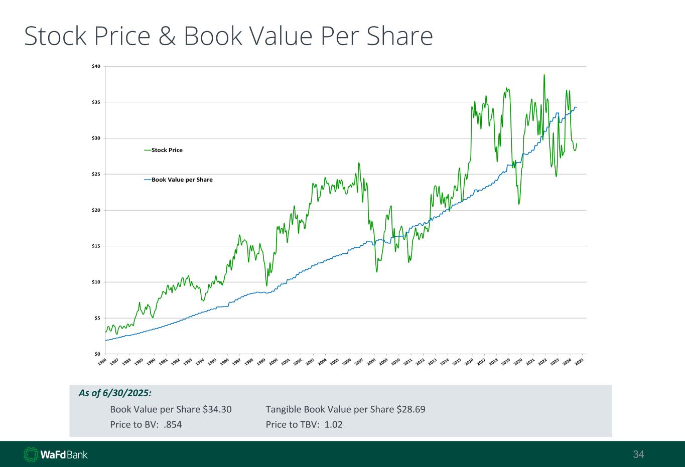 As of 6/30/2025: Book Value per Share $34.30 Tangible Book Value per Share $28.69 Price to BV: .854 Price to TBV: 1.02 Stock Price & Book Value Per Share 34