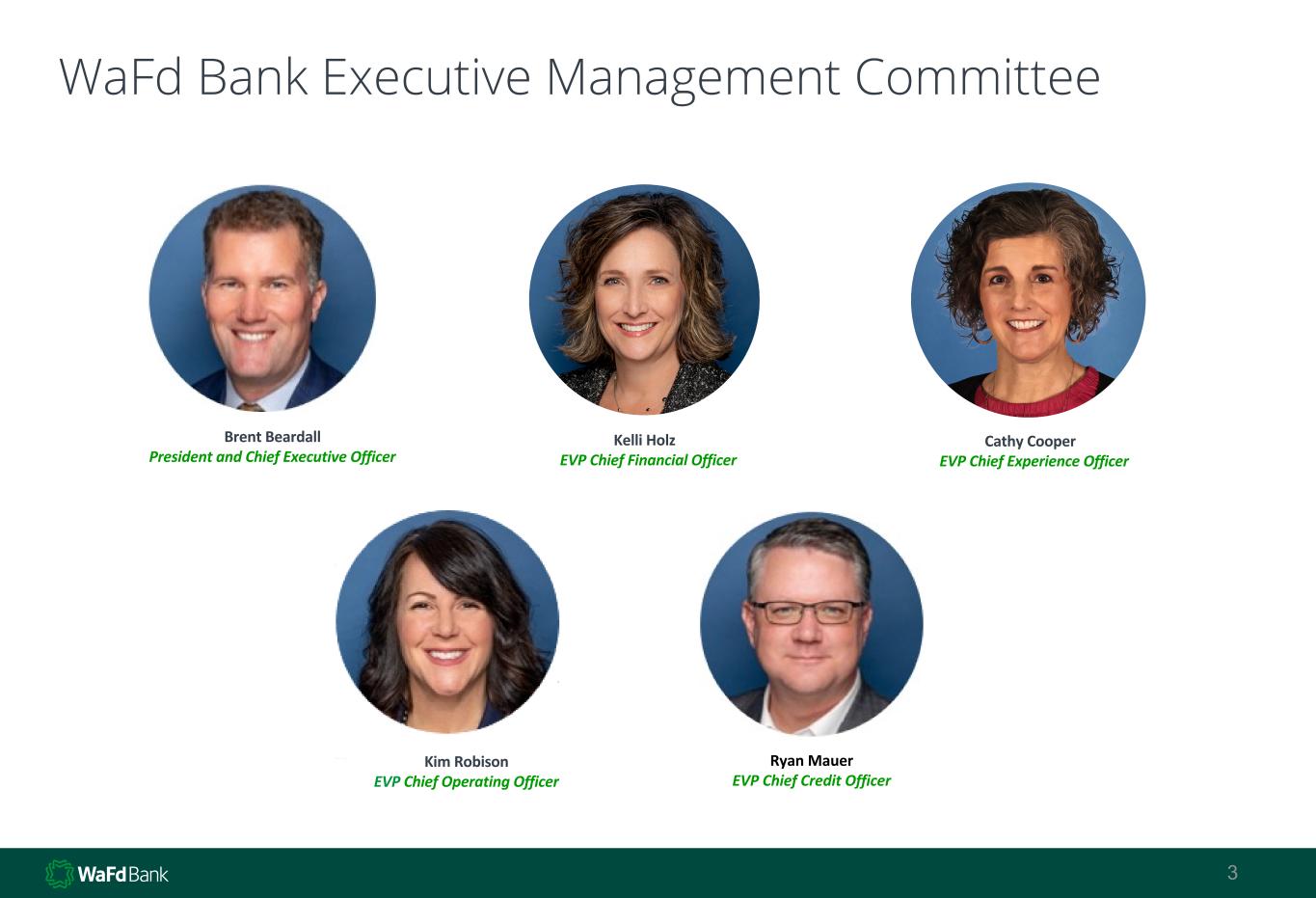Overview of WaFd Bank 2 • Established in 1917; IPO in 1982 • Washington State Charter Commercial Bank – WA DFI, FDIC, FRB, CFPB Regulated • Headquartered in Seattle, WA; is the second largest bank headquartered in the Pacific Northwest • 208 branches across 9 western states • Full-service consumer & commercial bank • Strong capital, high asset quality, consistent results • Profitable every year since 1965 • Interest rate risk management – well controlled • 171 consecutive quarterly cash dividends • 14,796% Total shareholder return since IPO Total Assets $27.3B Total Loans HFI $19.8B Total Deposits $21.4B Stockholder Equity $3.0B Efficiency Ratio 55.3% Adjusted Efficiency Ratio 56.1% 1 As of or for the quarter-ended December 31, 2025 Overview Geographic Overview Company Highlights1 2