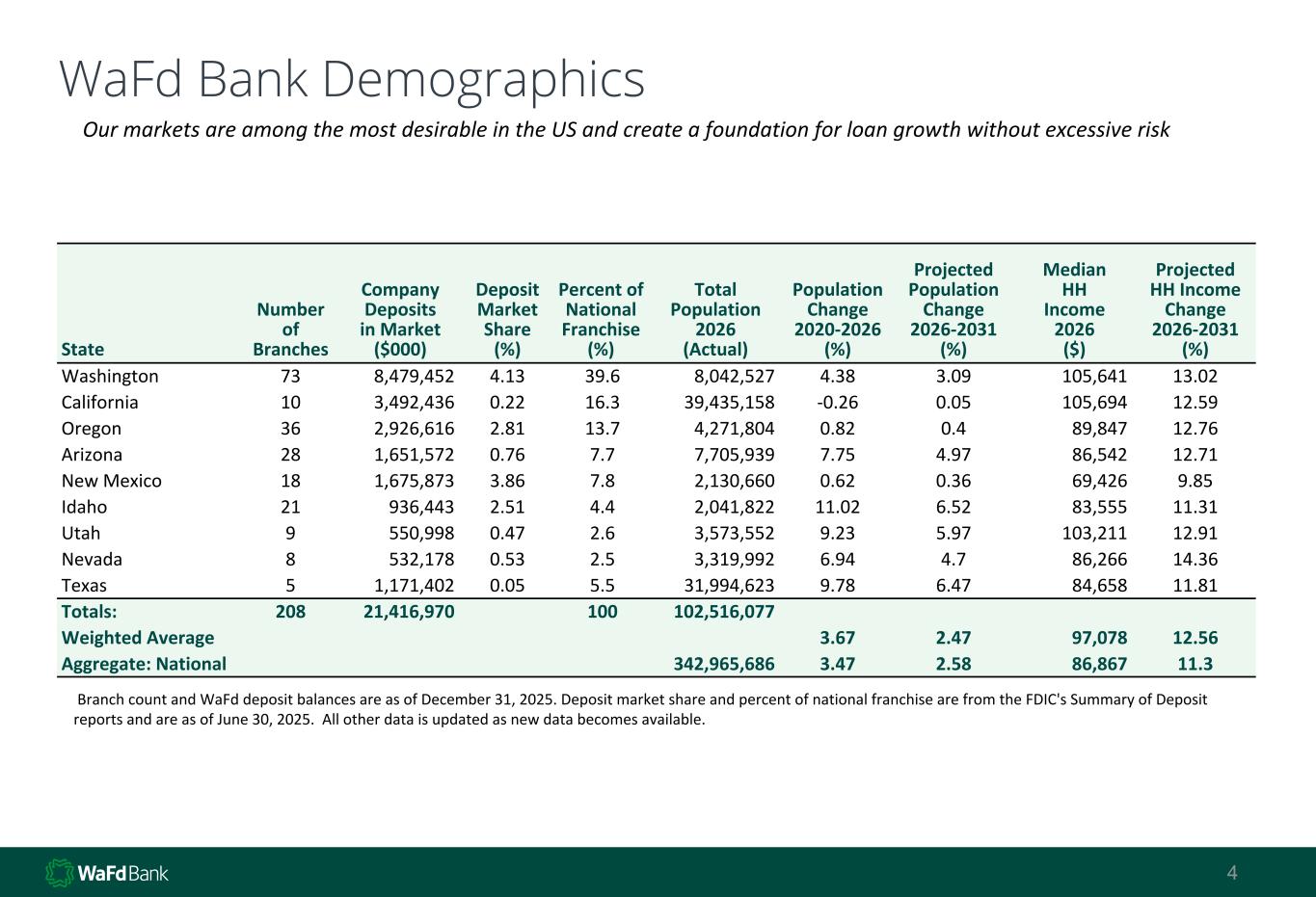4 WaFd Bank Demographics Our markets are among the most desirable in the US and create a foundation for loan growth without excessive risk State Number of Branches Company Deposits in Market ($000) Deposit Market Share (%) Percent of National Franchise (%) Total Population 2026 (Actual) Population Change 2020-2026 (%) Projected Population Change 2026-2031 (%) Median HH Income 2026 ($) Projected HH Income Change 2026-2031 (%) Washington 73 8,479,452 4.13 39.6 8,042,527 4.38 3.09 105,641 13.02 California 10 3,492,436 0.22 16.3 39,435,158 -0.26 0.05 105,694 12.59 Oregon 36 2,926,616 2.81 13.7 4,271,804 0.82 0.4 89,847 12.76 Arizona 28 1,651,572 0.76 7.7 7,705,939 7.75 4.97 86,542 12.71 New Mexico 18 1,675,873 3.86 7.8 2,130,660 0.62 0.36 69,426 9.85 Idaho 21 936,443 2.51 4.4 2,041,822 11.02 6.52 83,555 11.31 Utah 9 550,998 0.47 2.6 3,573,552 9.23 5.97 103,211 12.91 Nevada 8 532,178 0.53 2.5 3,319,992 6.94 4.7 86,266 14.36 Texas 5 1,171,402 0.05 5.5 31,994,623 9.78 6.47 84,658 11.81 Totals: 208 21,416,970 100 102,516,077 Weighted Average 3.67 2.47 97,078 12.56 Aggregate: National 342,965,686 3.47 2.58 86,867 11.3 Branch count and WaFd deposit balances are as of December 31, 2025. Deposit market share and percent of national franchise are from the FDIC's Summary of Deposit reports and are as of June 30, 2025. All other data is updated as new data becomes available.
