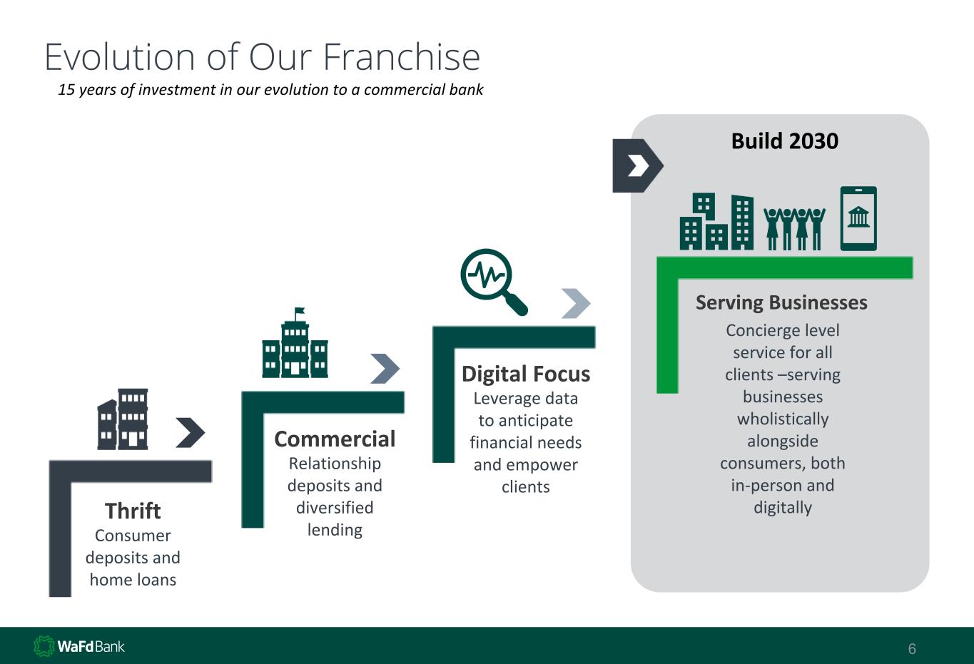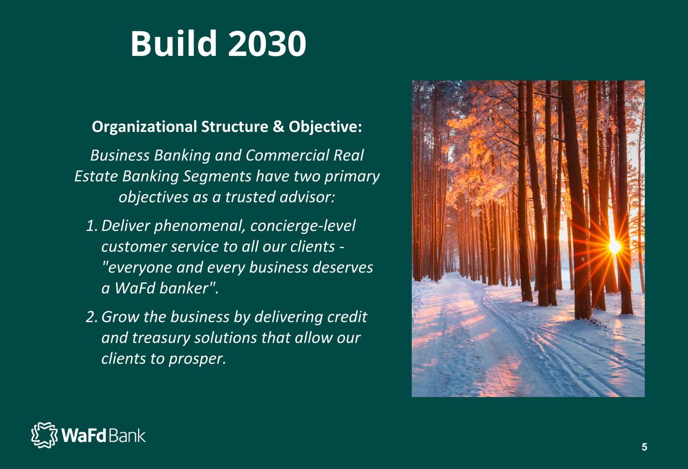 Organizational Structure & Objective: Business Banking and Commercial Real Estate Banking Segments have two primary objectives as a trusted advisor: 1.Deliver phenomenal, concierge-level customer service to all our clients - "everyone and every business deserves a WaFd banker". 2.Grow the business by delivering credit and treasury solutions that allow our clients to prosper. Build 2030 5