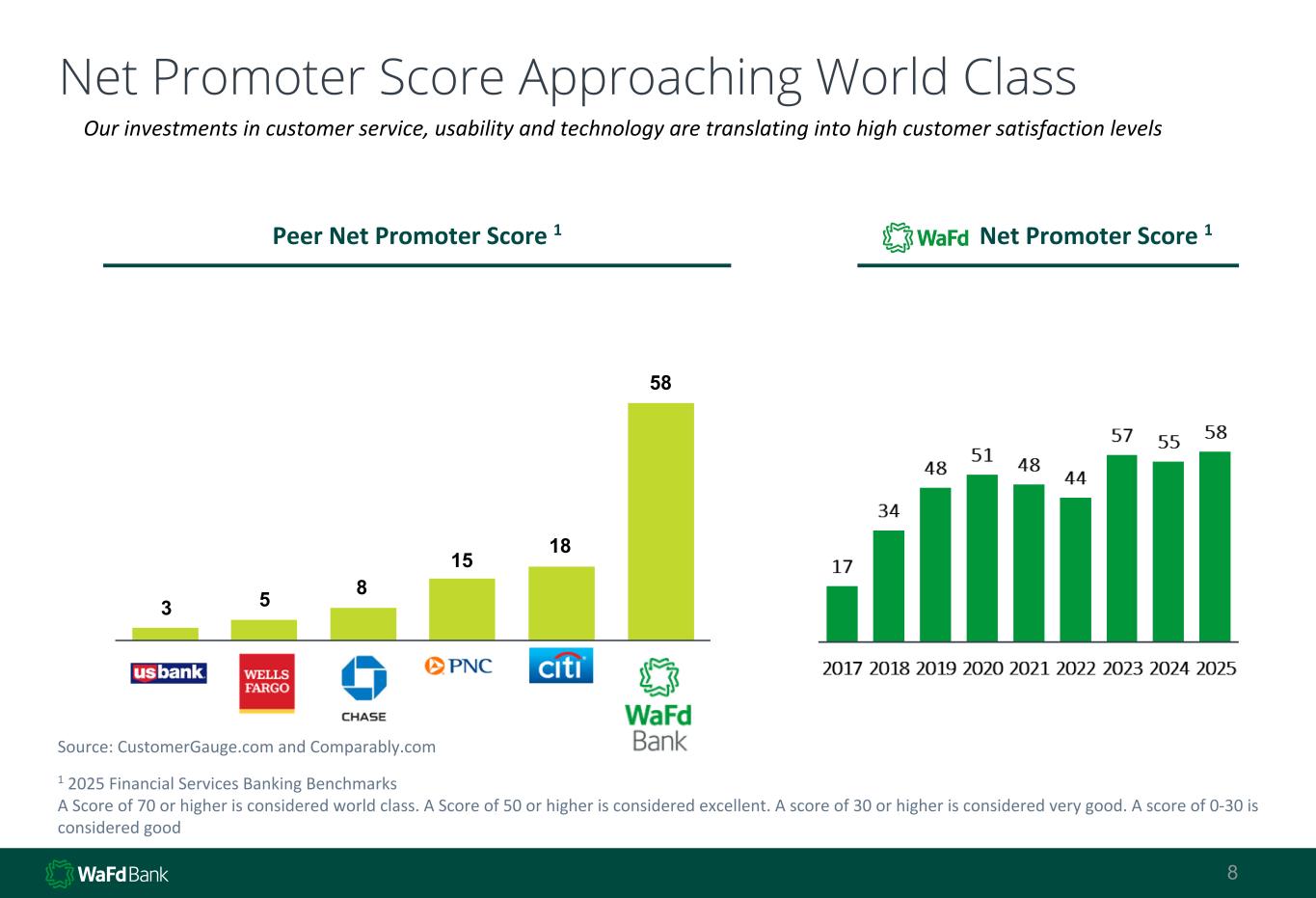 Net Promoter Score Approaching World Class 8 Our investments in customer service, usability and technology are translating into high customer satisfaction levels Source: CustomerGauge.com and Comparably.com WaFdaa Net Promoter Score 1Peer Net Promoter Score 1 1 2025 Financial Services Banking Benchmarks A Score of 70 or higher is considered world class. A Score of 50 or higher is considered excellent. A score of 30 or higher is considered very good. A score of 0-30 is considered good 8 15 18 58 853