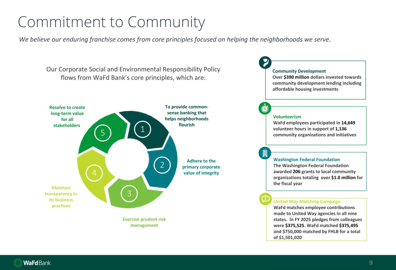 9 Commitment to Community We believe our enduring franchise comes from core principles focused on helping the neighborhoods we serve. Community Development Over $390 million dollars invested towards community development lending including affordable housing investments Washington Federal Foundation The Washington Federal Foundation awarded 206 grants to local community organizations totaling over $1.0 million for the fiscal year Volunteerism WaFd employees participated in 14,649 volunteer hours in support of 1,136 community organizations and initiatives United Way Matching Campaign WaFd matches employee contributions made to United Way agencies in all nine states. In FY 2025 pledges from colleagues were $375,525. WaFd matched $375,495 and $750,000 matched by FHLB for a total of $1,501,020 Our Corporate Social and Environmental Responsibility Policy flows from WaFd Bank’s core principles, which are: To provide common- sense banking that helps neighborhoods flourish Adhere to the primary corporate value of integrity Exercise prudent risk management Maintain transparency in its business practices Resolve to create long-term value for all stakeholders 1 2 3 4 5