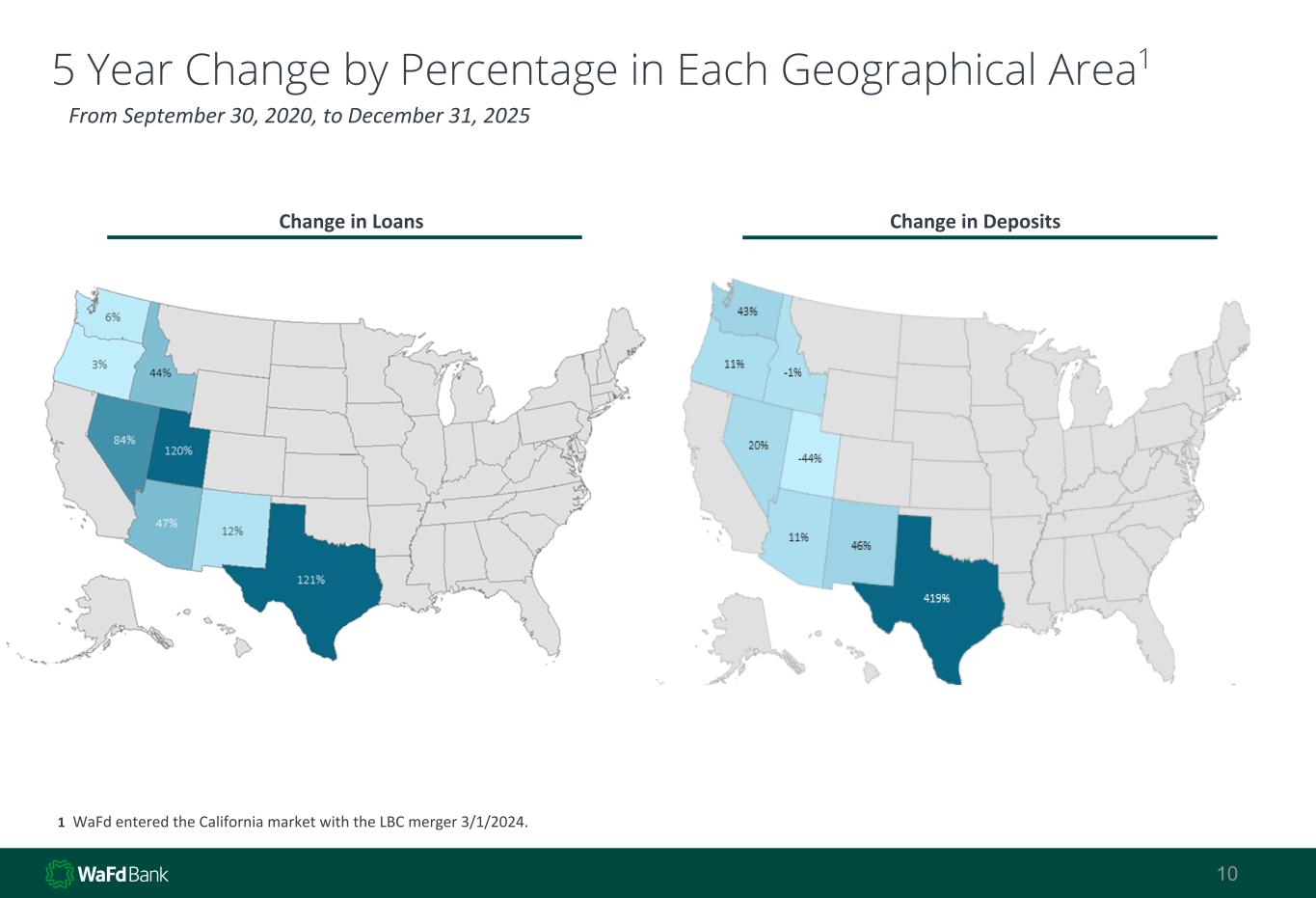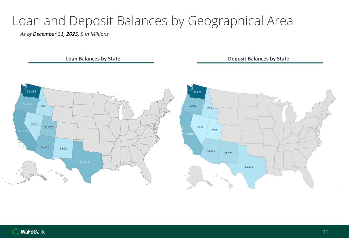 10 5 Year Change by Percentage in Each Geographical Area1 From September 30, 2020, to December 31, 2025 1 WaFd entered the California market with the LBC merger 3/1/2024. Change in Loans Change in Deposits