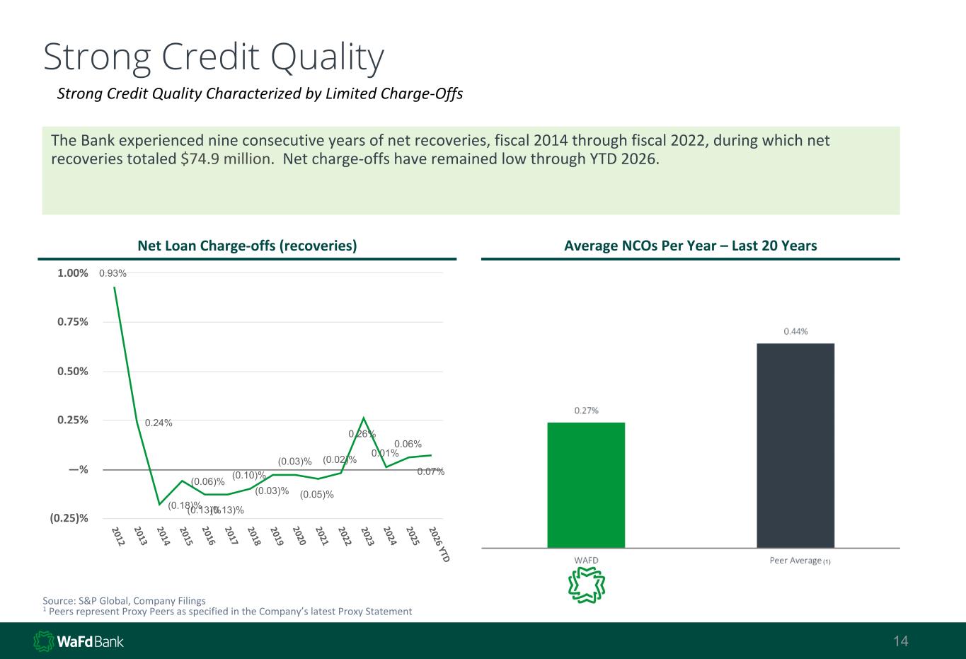 Non-Performing Asset Trends 13 We have maintained a strong ACL while NPAs remain low • ACL at December 31, 2025 amounted to $200 million, representing 98% of total NPAs (1) • Non-performing assets were $203 million as of December 31, 2025, 0.75% of Total Assets Non-Performing Assets to Total Assets and ACL to Gross Loans (1) (2) 1 ACL does not include reserve for unfunded commitments which was $21.5 million at December 31, 2025. 2 Effective October 1, 2020, the Company implemented FASB’s Current Expected Credit Loss (CECL) Standard 2 2.76% 2.18% 1.63% 1.00% 0.88% 0.67% 0.64% 0.53% 0.48% 0.20% 0.22% 0.21% 0.26% 0.28% 0.54% 0.75% 1.40% 1.51% 1.42% 1.30% 1.10% 1.04% 1.01% 1.01% 0.99% 1.15% 1.05% 0.89% 0.90% 0.91% 0.94% 0.95% Non-Performing Assets to Total Assets ACL to Gross Loans 20 11 20 12 20 13 20 14 20 15 20 16 20 17 20 18 20 19 20 20 20 21 20 22 20 23 20 24 20 25 20 26 YT D