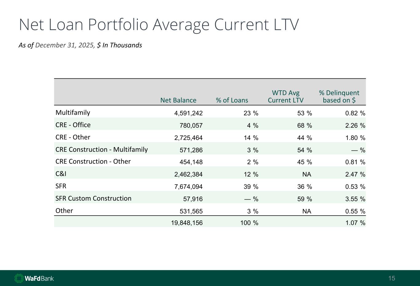 Strong Credit Quality 14 Net Loan Charge-offs (recoveries) Average NCOs Per Year – Last 20 Years Source: S&P Global, Company Filings 1 Peers represent Proxy Peers as specified in the Company’s latest Proxy Statement (1) Strong Credit Quality Characterized by Limited Charge-Offs The Bank experienced nine consecutive years of net recoveries, fiscal 2014 through fiscal 2022, during which net recoveries totaled $74.9 million. Net charge-offs have remained low through YTD 2026. 0.93% 0.24% (0.18)% (0.06)% (0.13)%(0.13)% (0.10)% (0.03)% (0.03)% (0.05)% (0.02)% 0.26% 0.01% 0.06% 0.07% 2012 2013 2014 2015 2016 2017 2018 2019 2020 2021 2022 2023 2024 2025 2026 YTD (0.25)% —% 0.25% 0.50% 0.75% 1.00%