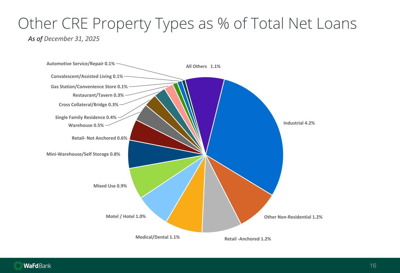 Net Loan Portfolio Average Current LTV 15 As of December 31, 2025, $ In Thousands Net Balance % of Loans WTD Avg Current LTV % Delinquent based on $ Multifamily 4,591,242 23 % 53 % 0.82 % CRE - Office 780,057 4 % 68 % 2.26 % CRE - Other 2,725,464 14 % 44 % 1.80 % CRE Construction - Multifamily 571,286 3 % 54 % — % CRE Construction - Other 454,148 2 % 45 % 0.81 % C&I 2,462,384 12 % NA 2.47 % SFR 7,674,094 39 % 36 % 0.53 % SFR Custom Construction 57,916 — % 59 % 3.55 % Other 531,565 3 % NA 0.55 % 19,848,156 100 % 1.07 %