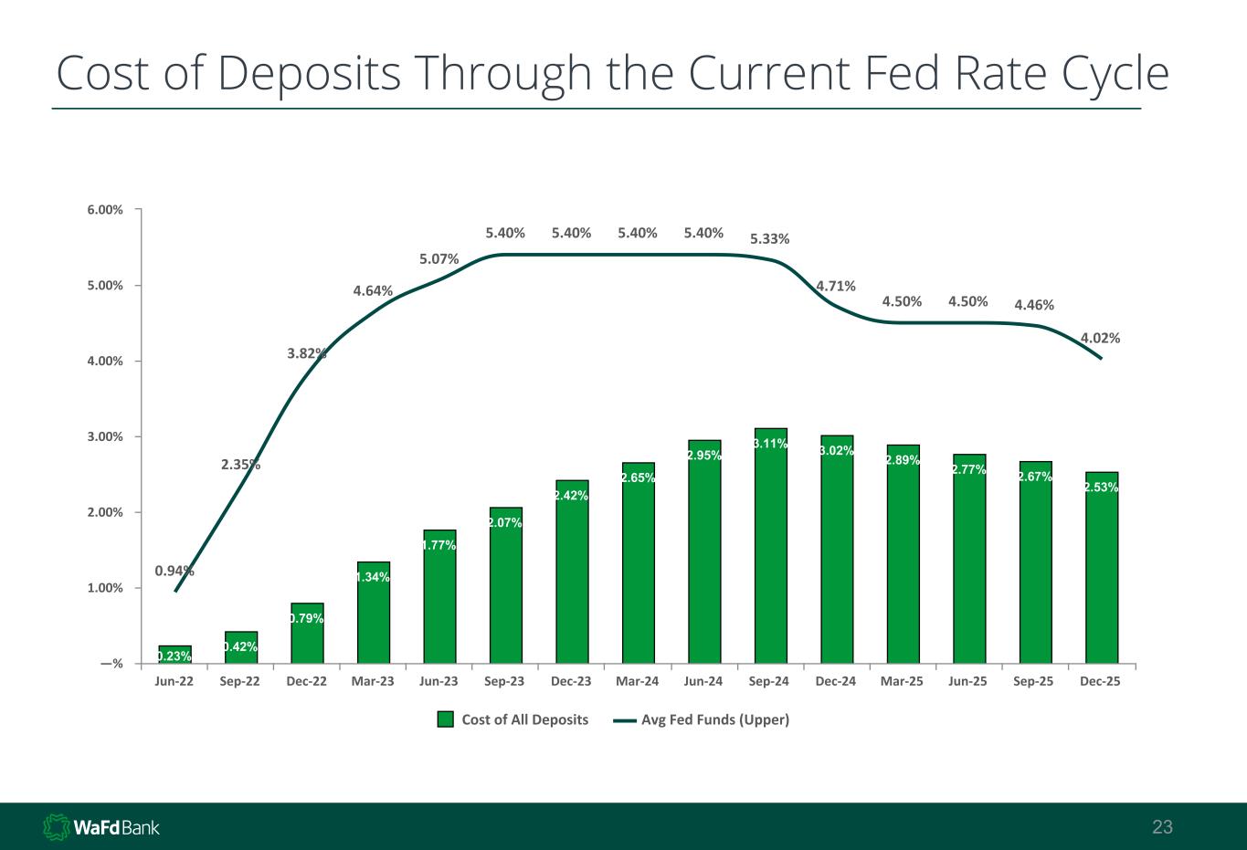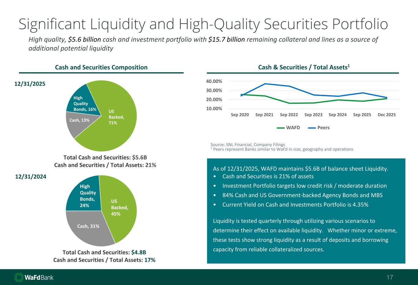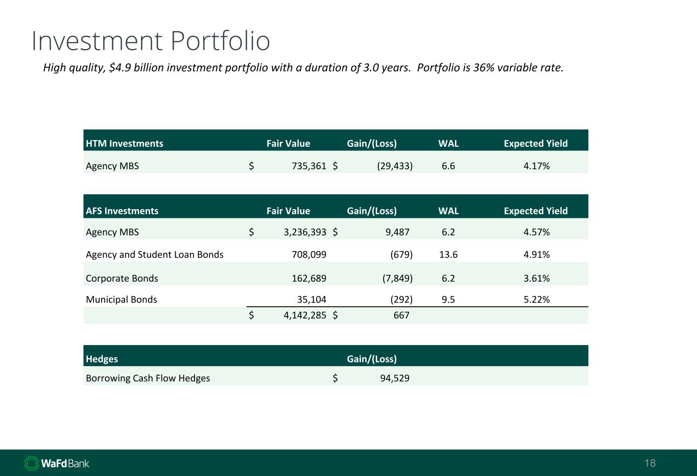 Significant Liquidity and High-Quality Securities Portfolio 17 High quality, $5.6 billion cash and investment portfolio with $15.7 billion remaining collateral and lines as a source of additional potential liquidity Cash and Securities Composition Total Cash and Securities: $5.6B Cash and Securities / Total Assets: 21% Cash & Securities / Total Assets1 As of 12/31/2025, WAFD maintains $5.6B of balance sheet Liquidity. • Cash and Securities is 21% of assets • Investment Portfolio targets low credit risk / moderate duration • 84% Cash and US Government-backed Agency Bonds and MBS • Current Yield on Cash and Investments Portfolio is 4.35% Liquidity is tested quarterly through utilizing various scenarios to determine their effect on available liquidity. Whether minor or extreme, these tests show strong liquidity as a result of deposits and borrowing capacity from reliable collateralized sources. Source: SNL Financial, Company Filings 1 Peers represent Banks similar to WaFd in size, geography and operations Total Cash and Securities: $4.8B Cash and Securities / Total Assets: 17% 12/31/2024 12/31/2025 US Backed, 71%Cash, 13% High Quality Bonds, 16% US Backed, 45% Cash, 31% High Quality Bonds, 24% WAFD Peers Sep 2020 Sep 2021 Sep 2022 Sep 2023 Sep 2024 Sep 2025 Dec 2025 10.00% 20.00% 30.00% 40.00%