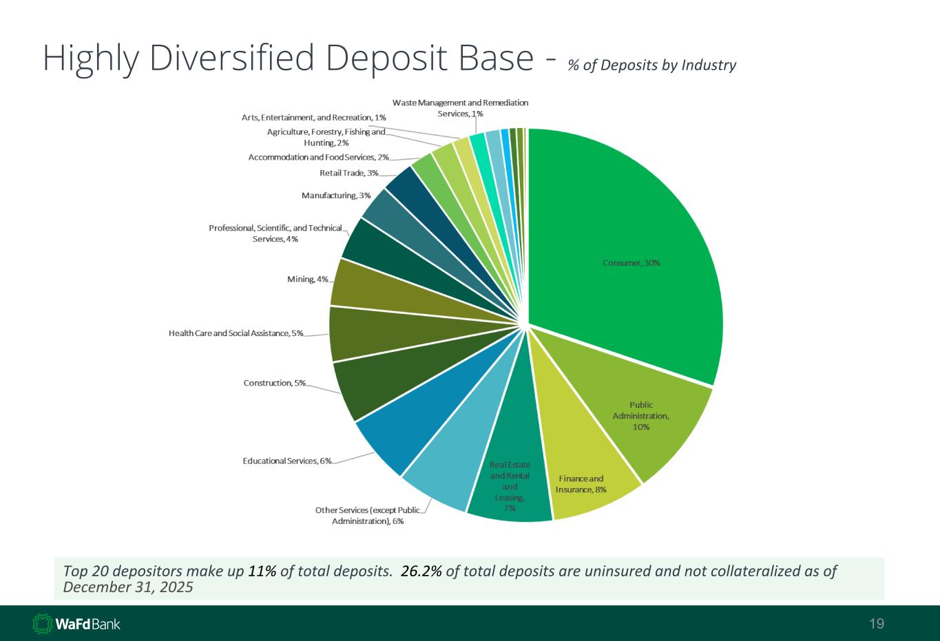 Highly Diversified Deposit Base - % of Deposits by Industry 19 Top 20 depositors make up 11% of total deposits. 26.2% of total deposits are uninsured and not collateralized as of December 31, 2025