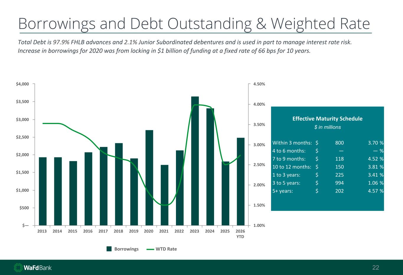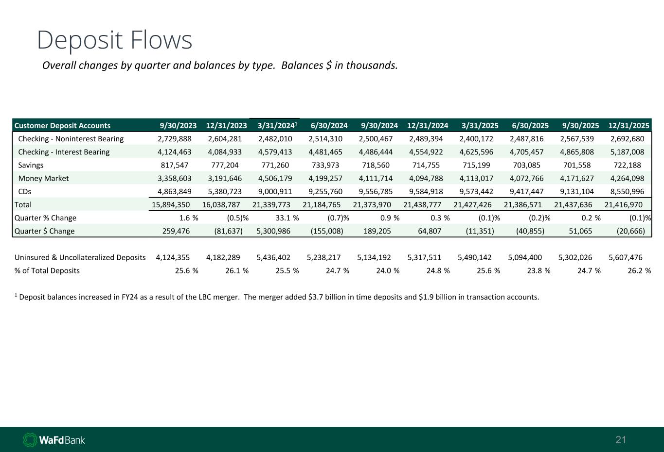 21 Deposit Flows Overall changes by quarter and balances by type. Balances $ in thousands. Customer Deposit Accounts 9/30/2023 12/31/2023 3/31/20241 6/30/2024 9/30/2024 12/31/2024 3/31/2025 6/30/2025 9/30/2025 12/31/2025 Checking - Noninterest Bearing 2,729,888 2,604,281 2,482,010 2,514,310 2,500,467 2,489,394 2,400,172 2,487,816 2,567,539 2,692,680 Checking - Interest Bearing 4,124,463 4,084,933 4,579,413 4,481,465 4,486,444 4,554,922 4,625,596 4,705,457 4,865,808 5,187,008 Savings 817,547 777,204 771,260 733,973 718,560 714,755 715,199 703,085 701,558 722,188 Money Market 3,358,603 3,191,646 4,506,179 4,199,257 4,111,714 4,094,788 4,113,017 4,072,766 4,171,627 4,264,098 CDs 4,863,849 5,380,723 9,000,911 9,255,760 9,556,785 9,584,918 9,573,442 9,417,447 9,131,104 8,550,996 Total 15,894,350 16,038,787 21,339,773 21,184,765 21,373,970 21,438,777 21,427,426 21,386,571 21,437,636 21,416,970 Quarter % Change 1.6 % (0.5) % 33.1 % (0.7) % 0.9 % 0.3 % (0.1) % (0.2) % 0.2 % (0.1) % Quarter $ Change 259,476 (81,637) 5,300,986 (155,008) 189,205 64,807 (11,351) (40,855) 51,065 (20,666) Uninsured & Uncollateralized Deposits 4,124,355 4,182,289 5,436,402 5,238,217 5,134,192 5,317,511 5,490,142 5,094,400 5,302,026 5,607,476 % of Total Deposits 25.6 % 26.1 % 25.5 % 24.7 % 24.0 % 24.8 % 25.6 % 23.8 % 24.7 % 26.2 % 1 Deposit balances increased in FY24 as a result of the LBC merger. The merger added $3.7 billion in time deposits and $1.9 billion in transaction accounts.