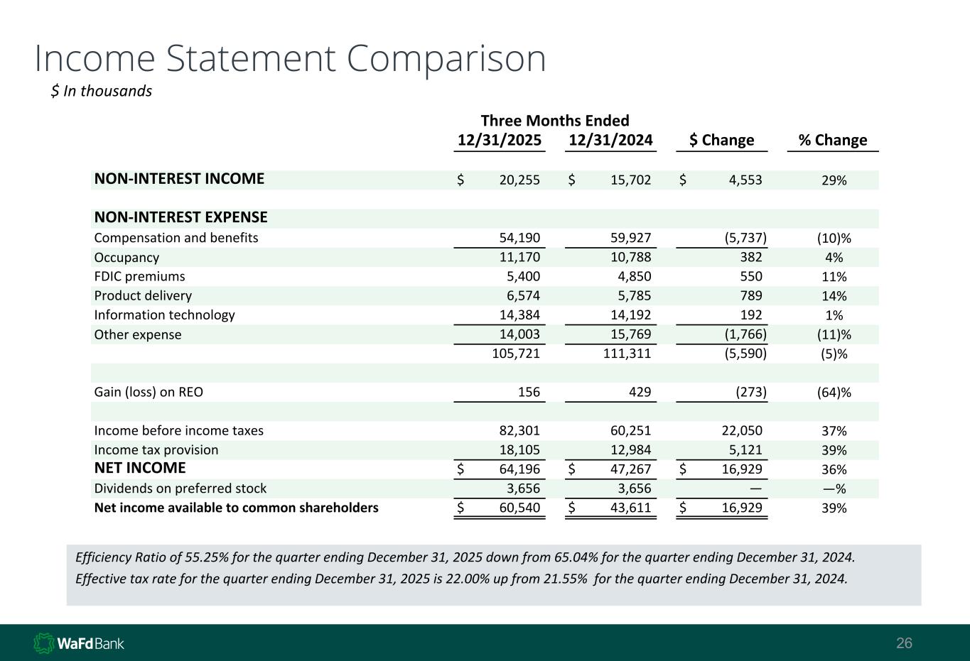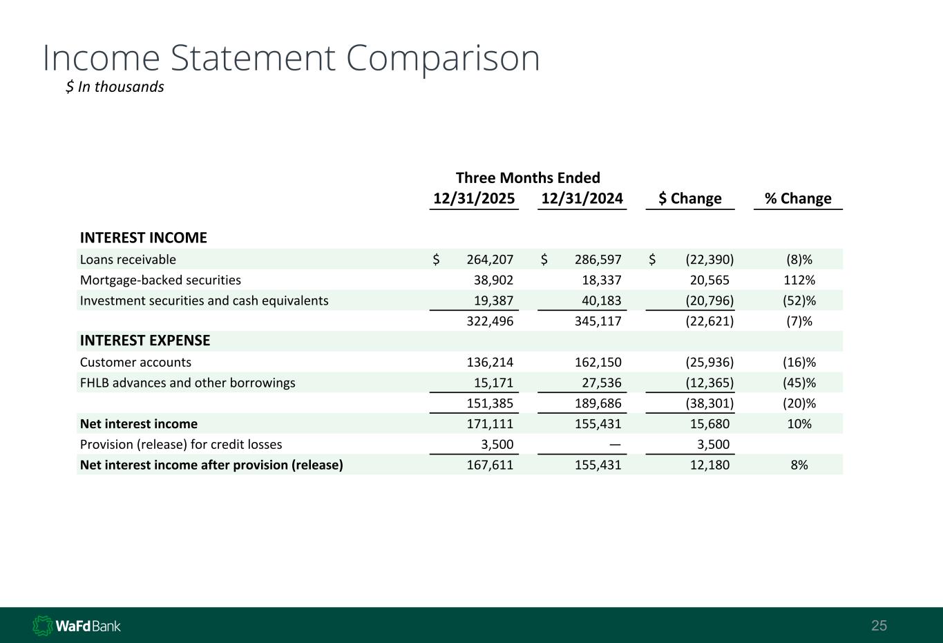 25 Income Statement Comparison 25 $ In thousands Three Months Ended 12/31/2025 12/31/2024 $ Change % Change INTEREST INCOME Loans receivable $ 264,207 $ 286,597 $ (22,390) (8)% Mortgage-backed securities 38,902 18,337 20,565 112% Investment securities and cash equivalents 19,387 40,183 (20,796) (52)% 322,496 345,117 (22,621) (7)% INTEREST EXPENSE Customer accounts 136,214 162,150 (25,936) (16)% FHLB advances and other borrowings 15,171 27,536 (12,365) (45)% 151,385 189,686 (38,301) (20)% Net interest income 171,111 155,431 15,680 10% Provision (release) for credit losses 3,500 — 3,500 Net interest income after provision (release) 167,611 155,431 12,180 8%