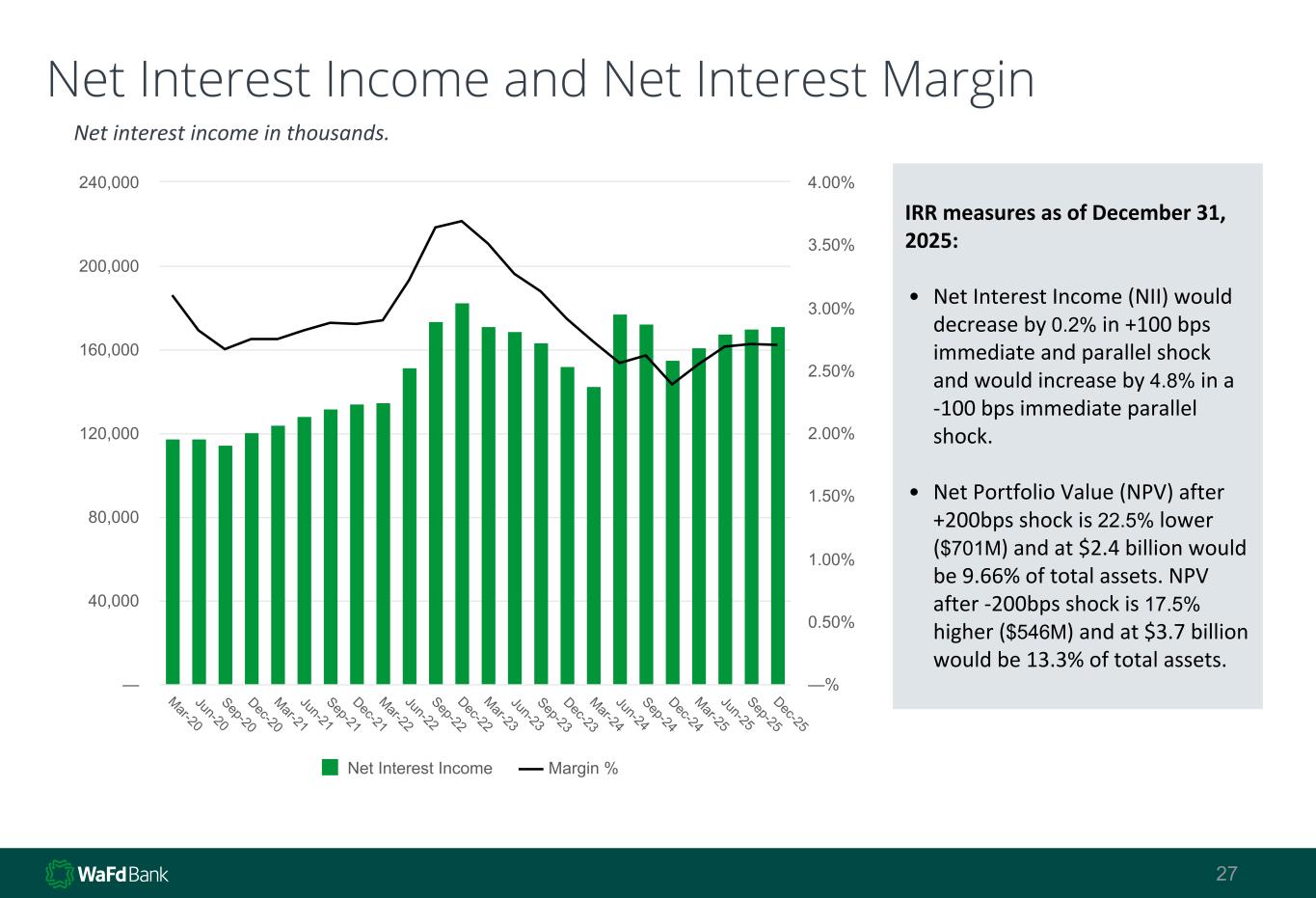 27 Net Interest Income and Net Interest Margin Net interest income in thousands. IRR measures as of December 31, 2025: • Net Interest Income (NII) would decrease by 0.2% in +100 bps immediate and parallel shock and would increase by 4.8% in a -100 bps immediate parallel shock. • Net Portfolio Value (NPV) after +200bps shock is 22.5% lower ($701M) and at $2.4 billion would be 9.66% of total assets. NPV after -200bps shock is 17.5% higher ($546M) and at $3.7 billion would be 13.3% of total assets. Net Interest Income Margin % Mar-20 Jun-20 Sep-20 Dec-20 Mar-21 Jun-21 Sep-21 Dec-21 Mar-22 Jun-22 Sep-22 Dec-22 Mar-23 Jun-23 Sep-23 Dec-23 Mar-24 Jun-24 Sep-24 Dec-24 Mar-25 Jun-25 Sep-25 Dec-25 — 40,000 80,000 120,000 160,000 200,000 240,000 —% 0.50% 1.00% 1.50% 2.00% 2.50% 3.00% 3.50% 4.00%