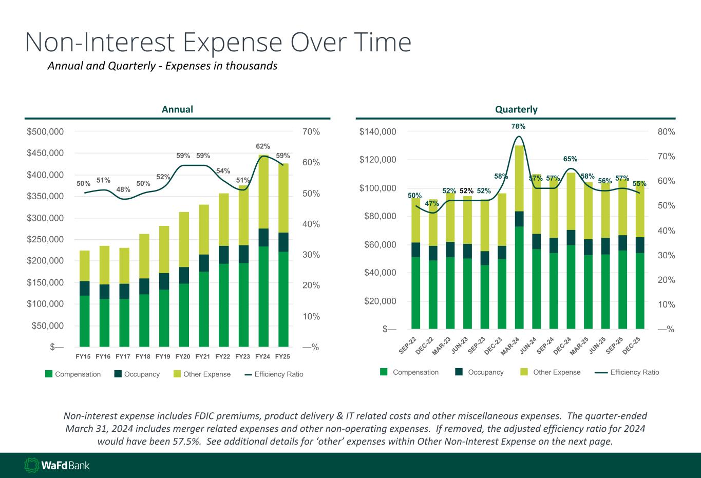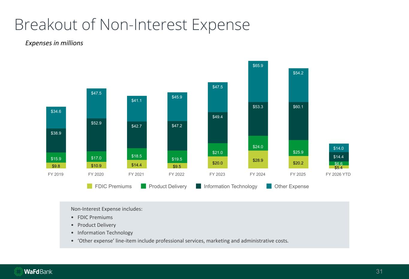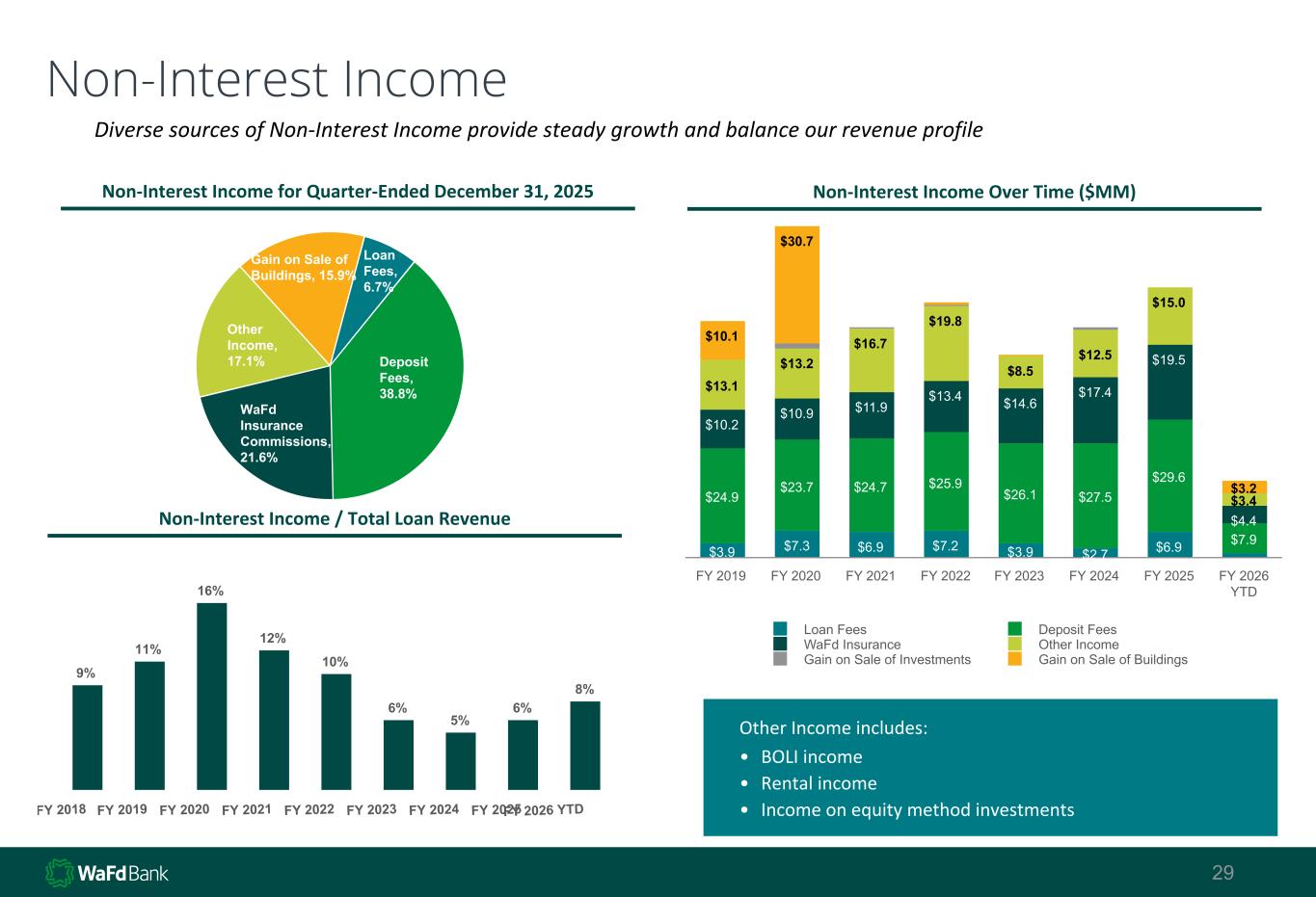 29 Diverse sources of Non-Interest Income provide steady growth and balance our revenue profile Non-Interest Income for Quarter-Ended December 31, 2025 Non-Interest Income Over Time ($MM) Non-Interest Income / Total Loan Revenue Other Income includes: • BOLI income • Rental income • Income on equity method investments Loan Fees, 6.7% Deposit Fees, 38.8% WaFd Insurance Commissions, 21.6% Other Income, 17.1% Gain on Sale of Buildings, 15.9% 9% 11% 16% 12% 10% 6% 5% 6% 8% FY 2018 FY 2019 FY 2020 FY 2021 FY 2022 FY 2023 FY 2024 FY 2025FY 2026 YTD $3.9 $7.3 $6.9 $7.2 $3.9 $2.7 $6.9 $24.9 $23.7 $24.7 $25.9 $26.1 $27.5 $29.6 $7.9 $10.2 $10.9 $11.9 $13.4 $14.6 $17.4 $19.5 $4.4 $13.1 $13.2 $16.7 $19.8 $8.5 $12.5 $15.0 $3.4 $10.1 $30.7 $3.2 Loan Fees Deposit Fees WaFd Insurance Other Income Gain on Sale of Investments Gain on Sale of Buildings FY 2019 FY 2020 FY 2021 FY 2022 FY 2023 FY 2024 FY 2025 FY 2026 YTD Non-Interest Income
