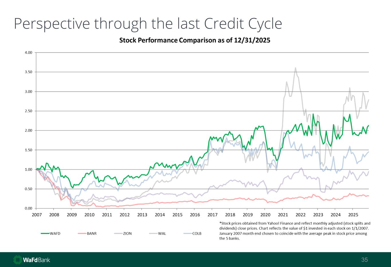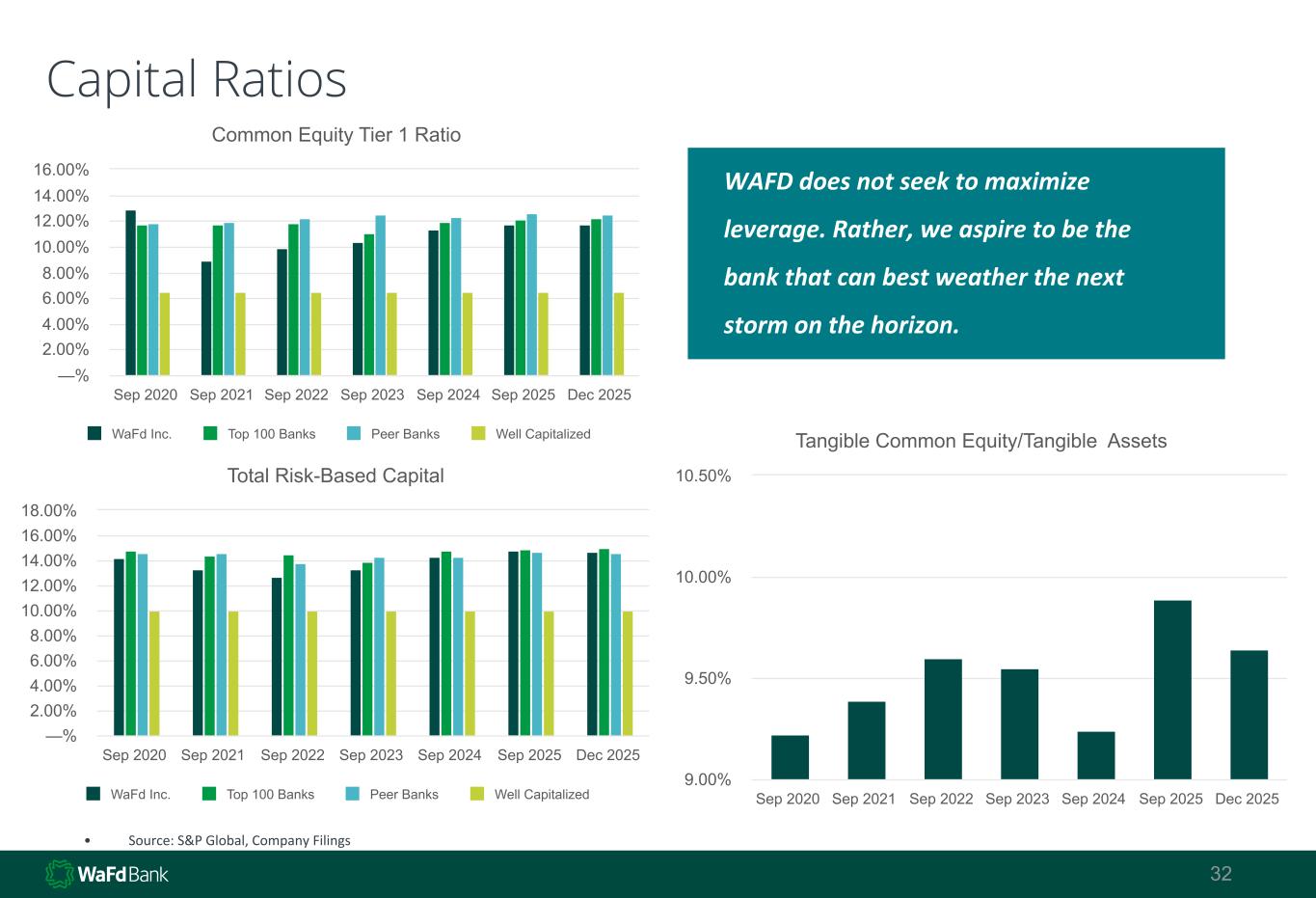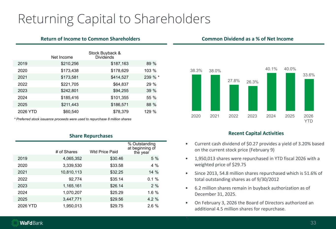 32 Capital Ratios WAFD does not seek to maximize leverage. Rather, we aspire to be the bank that can best weather the next storm on the horizon. • Source: S&P Global, Company Filings Common Equity Tier 1 Ratio WaFd Inc. Top 100 Banks Peer Banks Well Capitalized Sep 2020 Sep 2021 Sep 2022 Sep 2023 Sep 2024 Sep 2025 Dec 2025 —% 2.00% 4.00% 6.00% 8.00% 10.00% 12.00% 14.00% 16.00% Total Risk-Based Capital WaFd Inc. Top 100 Banks Peer Banks Well Capitalized Sep 2020 Sep 2021 Sep 2022 Sep 2023 Sep 2024 Sep 2025 Dec 2025 —% 2.00% 4.00% 6.00% 8.00% 10.00% 12.00% 14.00% 16.00% 18.00% Tangible Common Equity/Tangible Assets Sep 2020 Sep 2021 Sep 2022 Sep 2023 Sep 2024 Sep 2025 Dec 2025 9.00% 9.50% 10.00% 10.50%