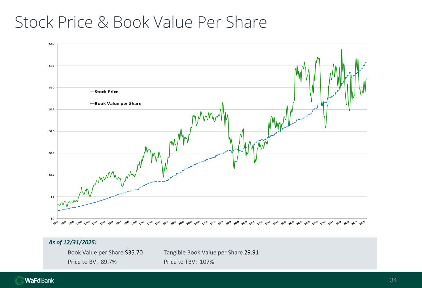 As of 12/31/2025: Book Value per Share $35.70 Tangible Book Value per Share 29.91 Price to BV: 89.7% Price to TBV: 107% Stock Price & Book Value Per Share 34