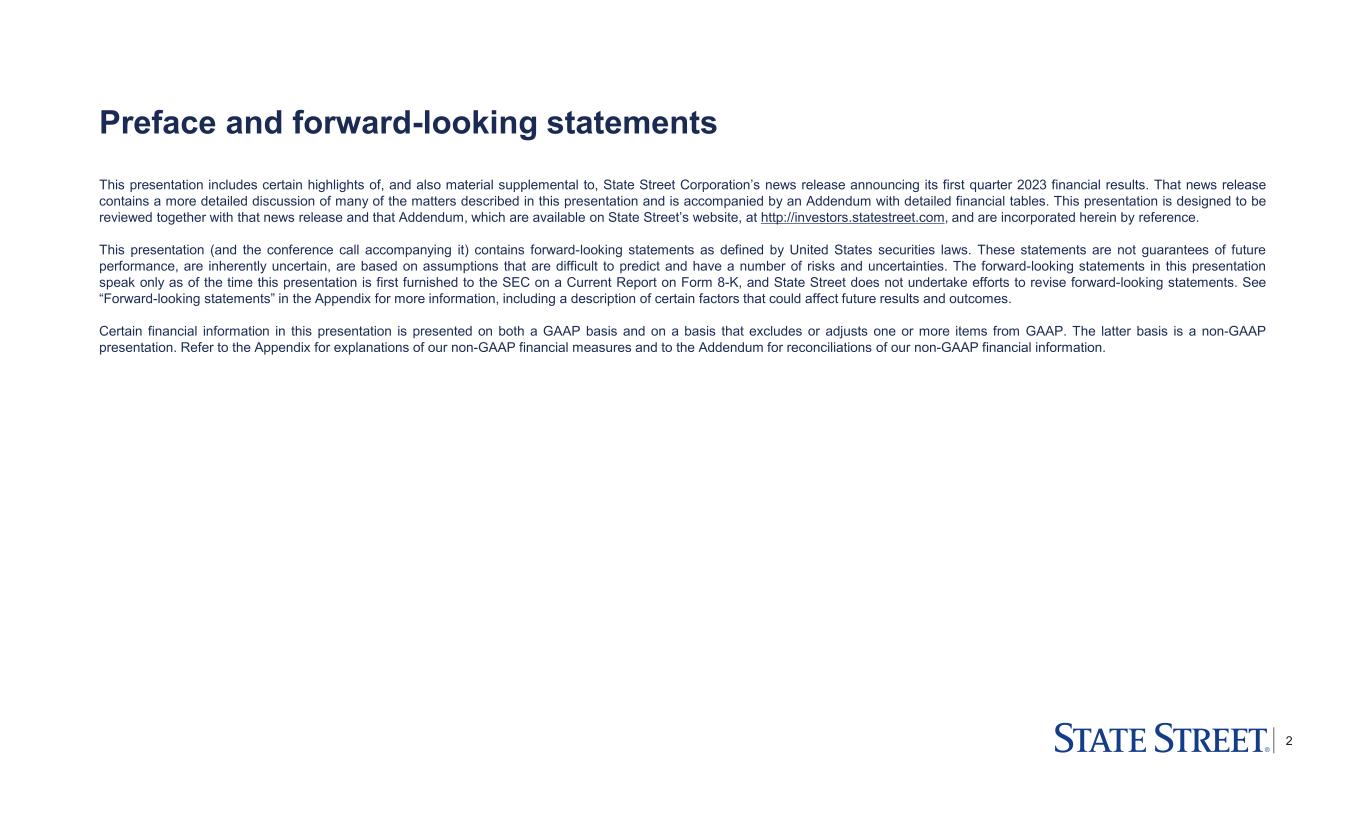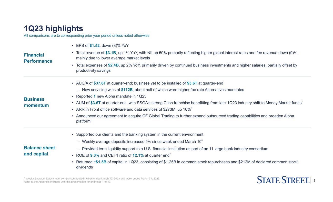 2 Preface and forward-looking statements This presentation includes certain highlights of, and also material supplemental to, State Street Corporation’s news release announcing its first quarter 2023 financial results. That news release contains a more detailed discussion of many of the matters described in this presentation and is accompanied by an Addendum with detailed financial tables. This presentation is designed to be reviewed together with that news release and that Addendum, which are available on State Street’s website, at http://investors.statestreet.com, and are incorporated herein by reference. This presentation (and the conference call accompanying it) contains forward-looking statements as defined by United States securities laws. These statements are not guarantees of future performance, are inherently uncertain, are based on assumptions that are difficult to predict and have a number of risks and uncertainties. The forward-looking statements in this presentation speak only as of the time this presentation is first furnished to the SEC on a Current Report on Form 8-K, and State Street does not undertake efforts to revise forward-looking statements. See “Forward-looking statements” in the Appendix for more information, including a description of certain factors that could affect future results and outcomes. Certain financial information in this presentation is presented on both a GAAP basis and on a basis that excludes or adjusts one or more items from GAAP. The latter basis is a non-GAAP presentation. Refer to the Appendix for explanations of our non-GAAP financial measures and to the Addendum for reconciliations of our non-GAAP financial information.