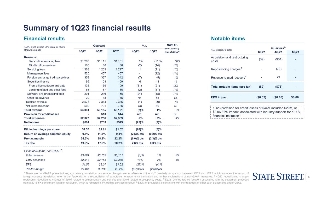 3 1Q23 highlights All comparisons are to corresponding prior year period unless noted otherwise A Weekly average deposit level comparison between week ended March 10, 2023 and week ended March 31, 2023. Refer to the Appendix included with this presentation for endnotes 1 to 19. Financial Performance • EPS of $1.52, down (3)% YoY • Total revenue of $3.1B, up 1% YoY, with NII up 50% primarily reflecting higher global interest rates and fee revenue down (9)% mainly due to lower average market levels • Total expenses of $2.4B, up 2% YoY, primarily driven by continued business investments and higher salaries, partially offset by productivity savings Business momentum • AUC/A of $37.6T at quarter-end; business yet to be installed of $3.6T at quarter-end1 ‒ New servicing wins of $112B, about half of which were higher fee rate Alternatives mandates • Reported 1 new Alpha mandate in 1Q23 • AUM of $3.6T at quarter-end, with SSGA’s strong Cash franchise benefitting from late-1Q23 industry shift to Money Market funds1 • ARR in Front office software and data services of $273M, up 16%2 • Announced our agreement to acquire CF Global Trading to further expand outsourced trading capabilities and broaden Alpha platform Balance sheet and capital • Supported our clients and the banking system in the current environment ‒ Weekly average deposits increased 5% since week ended March 10A ‒ Provided term liquidity support to a U.S. financial institution as part of an 11 large bank industry consortium • ROE of 9.3% and CET1 ratio of 12.1% at quarter end3 • Returned ~$1.5B of capital in 1Q23, consisting of $1.25B in common stock repurchases and $212M of declared common stock dividends