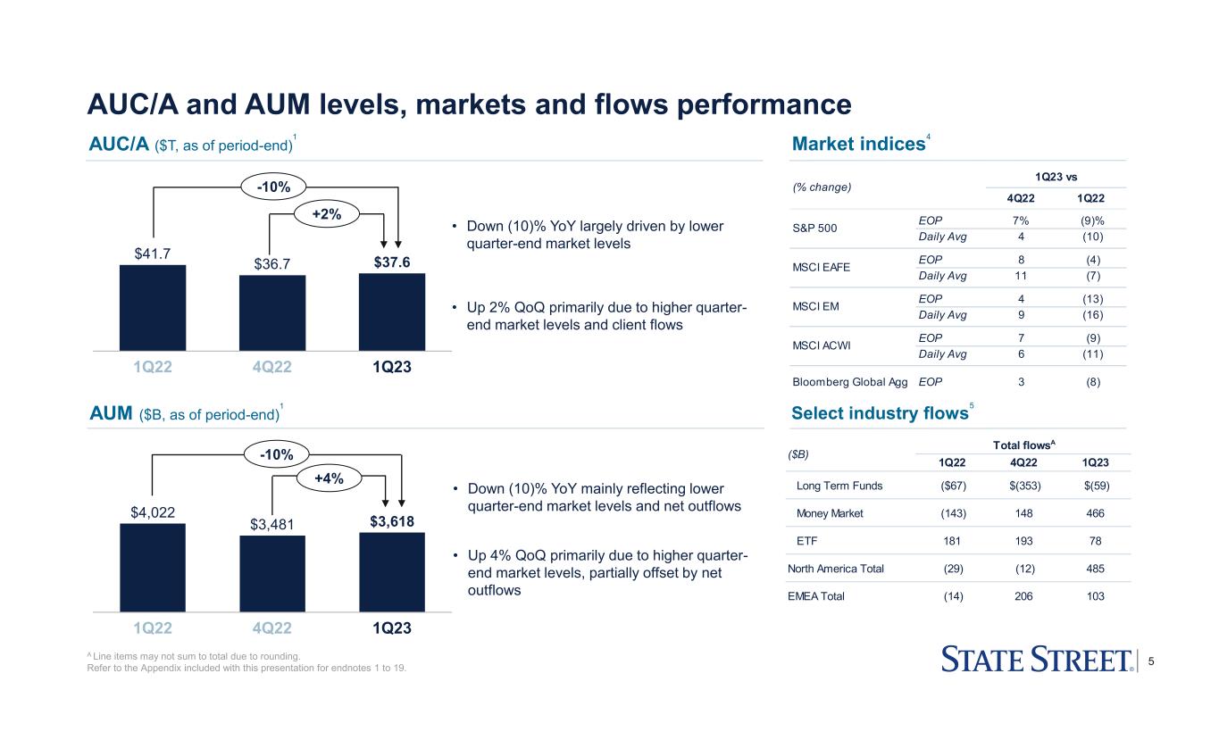 4 Summary of 1Q23 financial results A These are non-GAAP presentations; ex-currency translation percentage changes are in reference to the YoY quarterly comparison between 1Q23 and 1Q22 which excludes the impact of foreign currency translation; refer to the Appendix for a reconciliation of ex-notable items/currency translation and further explanations of non-GAAP measures. B 4Q22 repositioning charges represents repositioning charges of $50M related to compensation and benefits and $20M related to occupancy costs. C 4Q22 revenue-related recovery associated with the settlement proceeds from a 2018 FX benchmark litigation resolution, which is reflected in FX trading services revenue. D $29M of provisions is consistent with the treatment of other cash placements under CECL. 1Q22 4Q22 1Q23 4Q22 1Q22 Revenue: Back office servicing fees $1,268 $1,115 $1,131 1% (11)% (9)% Middle office services 100 88 86 (2) (14) (13) Servicing fees 1,368 1,203 1,217 1 (11) (10) Management fees 520 457 457 - (12) (11) Foreign exchange trading services 359 367 342 (7) (5) (5) Securities finance 96 103 109 6 14 15 Front office software and data 138 159 109 (31) (21) (20) Lending related and other fees 63 57 56 (2) (11) (11) Software and processing fees 201 216 165 (24) (18) (17) Other fee revenue 29 18 45 nm 55 55 Total fee revenue 2,573 2,364 2,335 (1) (9) (8) Net interest income 509 791 766 (3) 50 52 Total revenue $3,081 $3,155 $3,101 (2)% 1% 2% Provision for credit losses - $10 $44 nm nm nm Total expenses $2,327 $2,256 $2,369 5% 2% 4% Net income $604 $733 $549 (25)% (9)% Diluted earnings per share $1.57 $1.91 $1.52 (20)% (3)% Return on average common equity 9.5% 11.8% 9.3% (2.5)%pts (0.2)%pts Pre-tax margin 24.5% 28.2% 22.2% (6.0)%pts (2.3)%pts Tax rate 19.9% 17.6% 20.2% 2.6%pts 0.3%pts Ex-notable items, non-GAAP A: Total revenue $3,081 $3,132 $3,101 (1)% 1% 2% Total expenses $2,318 $2,155 $2,369 10% 2% 4% EPS $1.59 $2.07 $1.52 (27)% (4)% Pre-tax margin 24.8% 30.9% 22.2% (8.7)%pts (2.6)%pts (GAAP; $M, except EPS data, or where otherwise noted) Quarters %∆ 1Q22 %∆ ex-currency translation A 1Q22 4Q22 1Q23 Acquisition and restructuring costs ($9) ($31) - Repositioning chargesB - (70) - Revenue-related recoveryC - 23 - Total notable items (pre-tax) ($9) ($78) - EPS impact ($0.02) ($0.16) $0.00 ($M, except EPS data) QuartersA Financial results Notable items 1Q23 provision for credit losses of $44M included $29M, or $0.06 EPS impact, associated with industry support for a U.S. financial institutionD