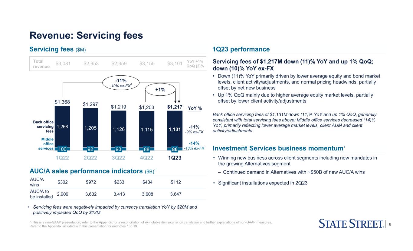 5 AUC/A and AUM levels, markets and flows performance AUC/A ($T, as of period-end) 1 Market indices4 • Down (10)% YoY largely driven by lower quarter-end market levels • Up 2% QoQ primarily due to higher quarter- end market levels and client flows • Down (10)% YoY mainly reflecting lower quarter-end market levels and net outflows • Up 4% QoQ primarily due to higher quarter- end market levels, partially offset by net outflows AUM ($B, as of period-end) 1 Select industry flows5 +4% +2% $41.7 $36.7 $37.6 1Q22 4Q22 1Q23 1Q22 4Q22 1Q23 $4,022 $3,481 $3,618 -10% -10% A Line items may not sum to total due to rounding. Refer to the Appendix included with this presentation for endnotes 1 to 19. 4Q22 1Q22 EOP 7% (9)% Daily Avg 4 (10) EOP 8 (4) Daily Avg 11 (7) EOP 4 (13) Daily Avg 9 (16) EOP 7 (9) Daily Avg 6 (11) (% change) 1Q23 vs S&P 500 MSCI EAFE MSCI EM Bloomberg Global Agg EOP 3 (8) MSCI ACWI 1Q22 4Q22 1Q23 Long Term Funds ($67) $(353) $(59) Money Market (143) 148 466 ETF 181 193 78 North America Total (29) (12) 485 EMEA Total (14) 206 103 ($B) Total flowsA