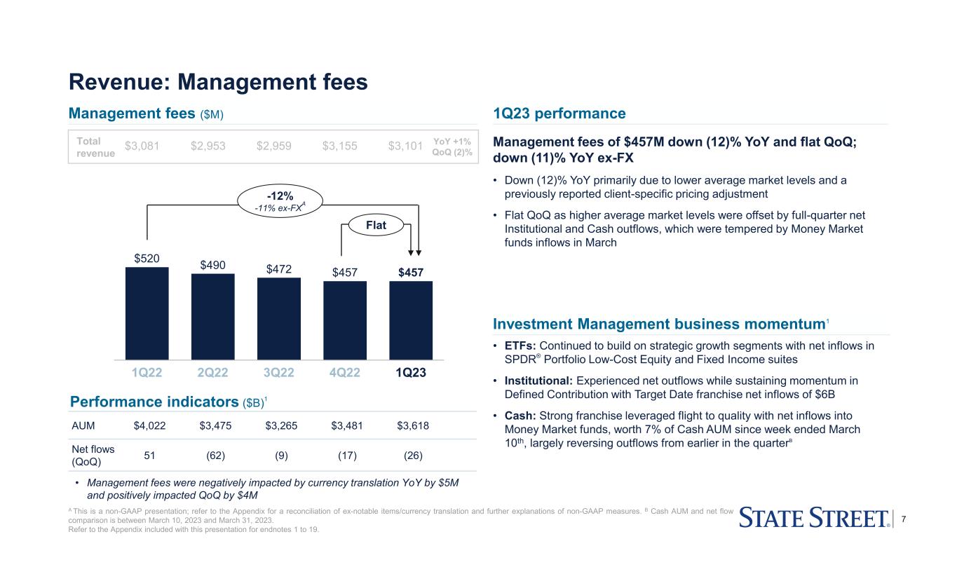 6 Servicing fees of $1,217M down (11)% YoY and up 1% QoQ; down (10)% YoY ex-FX • Down (11)% YoY primarily driven by lower average equity and bond market levels, client activity/adjustments, and normal pricing headwinds, partially offset by net new business • Up 1% QoQ mainly due to higher average equity market levels, partially offset by lower client activity/adjustments Back office servicing fees of $1,131M down (11)% YoY and up 1% QoQ, generally consistent with total servicing fees above; Middle office services decreased (14)% YoY, primarily reflecting lower average market levels, client AUM and client activity/adjustments Revenue: Servicing fees Servicing fees ($M) 1Q23 performance 1,268 1,205 1,126 1,115 1,131 100 1Q22 92 2Q22 93 3Q22 88 4Q22 86 1Q23 $1,368 $1,297 $1,219 $1,203 $1,217 $3,081 $2,953 $2,959 $3,155 $3,101 YoY +1% QoQ (2)% Total revenue • Servicing fees were negatively impacted by currency translation YoY by $20M and positively impacted QoQ by $12M Investment Services business momentum1 • Winning new business across client segments including new mandates in the growing Alternatives segment – Continued demand in Alternatives with ~$50B of new AUC/A wins • Significant installations expected in 2Q23 A This is a non-GAAP presentation; refer to the Appendix for a reconciliation of ex-notable items/currency translation and further explanations of non-GAAP measures. Refer to the Appendix included with this presentation for endnotes 1 to 19. -11% -10% ex-FXA +1% Back office servicing fees Middle office services -11% -9% ex-FX -14% -13% ex-FX YoY % $302 $972 $233 $434 $112 2,909 3,632 3,413 3,608 3,647 AUC/A sales performance indicators ($B)1 AUC/A wins AUC/A to be installed