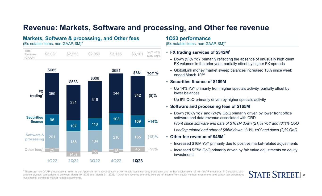 7 • ETFs: Continued to build on strategic growth segments with net inflows in SPDR® Portfolio Low-Cost Equity and Fixed Income suites • Institutional: Experienced net outflows while sustaining momentum in Defined Contribution with Target Date franchise net inflows of $6B • Cash: Strong franchise leveraged flight to quality with net inflows into Money Market funds, worth 7% of Cash AUM since week ended March 10th, largely reversing outflows from earlier in the quarterB Revenue: Management fees Management fees ($M) 1Q23 performance Management fees of $457M down (12)% YoY and flat QoQ; down (11)% YoY ex-FX • Down (12)% YoY primarily due to lower average market levels and a previously reported client-specific pricing adjustment • Flat QoQ as higher average market levels were offset by full-quarter net Institutional and Cash outflows, which were tempered by Money Market funds inflows in March Performance indicators ($B)1 • Management fees were negatively impacted by currency translation YoY by $5M and positively impacted QoQ by $4M 1Q22 2Q22 3Q22 4Q22 1Q23 $520 $490 $472 $457 $457 Investment Management business momentum1 A This is a non-GAAP presentation; refer to the Appendix for a reconciliation of ex-notable items/currency translation and further explanations of non-GAAP measures. B Cash AUM and net flow comparison is between March 10, 2023 and March 31, 2023. Refer to the Appendix included with this presentation for endnotes 1 to 19. $3,081 $2,953 $2,959 $3,155 $3,101Total revenue -12% -11% ex-FXA Flat AUM $4,022 $3,475 $3,265 $3,481 $3,618 Net flows (QoQ) 51 (62) (9) (17) (26) YoY +1% QoQ (2)%