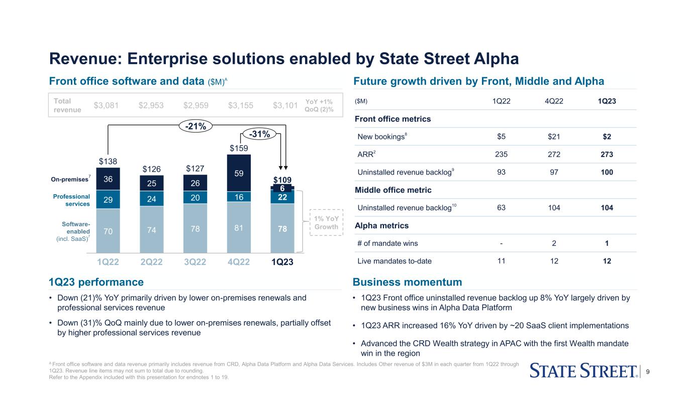 8 Revenue: Markets, Software and processing, and Other fee revenue $3,081 $2,953 $2,959 $3,155 $3,101 Total Revenue (GAAP) A These are non-GAAP presentations; refer to the Appendix for a reconciliation of ex-notable items/currency translation and further explanations of non-GAAP measures. B GlobalLink cash balance sweeps comparison is between March 10, 2023 and March 31, 2023. C Other fee revenue primarily consists of income from equity method investments and certain tax-advantaged investments, as well as market-related adjustments. YoY +1% QoQ (2)% Markets, Software & processing, and Other fees (Ex-notable items, non-GAAP, $M)A 1Q23 performance (Ex-notable items, non-GAAP, $M)A 184 45 201 110 216 165 96 319 103 109 359 344 342 29 1Q22 331 107 188 (43) 2Q22 (5) 3Q22 18 4Q22 1Q23 $685 $583 $608 $681 $661 FX trading6 Securities finance Software & processing (5)% +14% (18)% YoY % Other feesC +55% • FX trading services of $342M6 – Down (5)% YoY primarily reflecting the absence of unusually high client FX volumes in the prior year, partially offset by higher FX spreads – GlobalLink money market sweep balances increased 13% since week ended March 10thB • Securities finance of $109M – Up 14% YoY primarily from higher specials activity, partially offset by lower balances – Up 6% QoQ primarily driven by higher specials activity • Software and processing fees of $165M – Down (18)% YoY and (24)% QoQ primarily driven by lower front office software and data revenue associated with CRD Front office software and data of $109M down (21)% YoY and (31)% QoQ Lending related and other of $56M down (11)% YoY and down (2)% QoQ • Other fee revenue of $45MC – Increased $16M YoY primarily due to positive market-related adjustments – Increased $27M QoQ primarily driven by fair value adjustments on equity investments