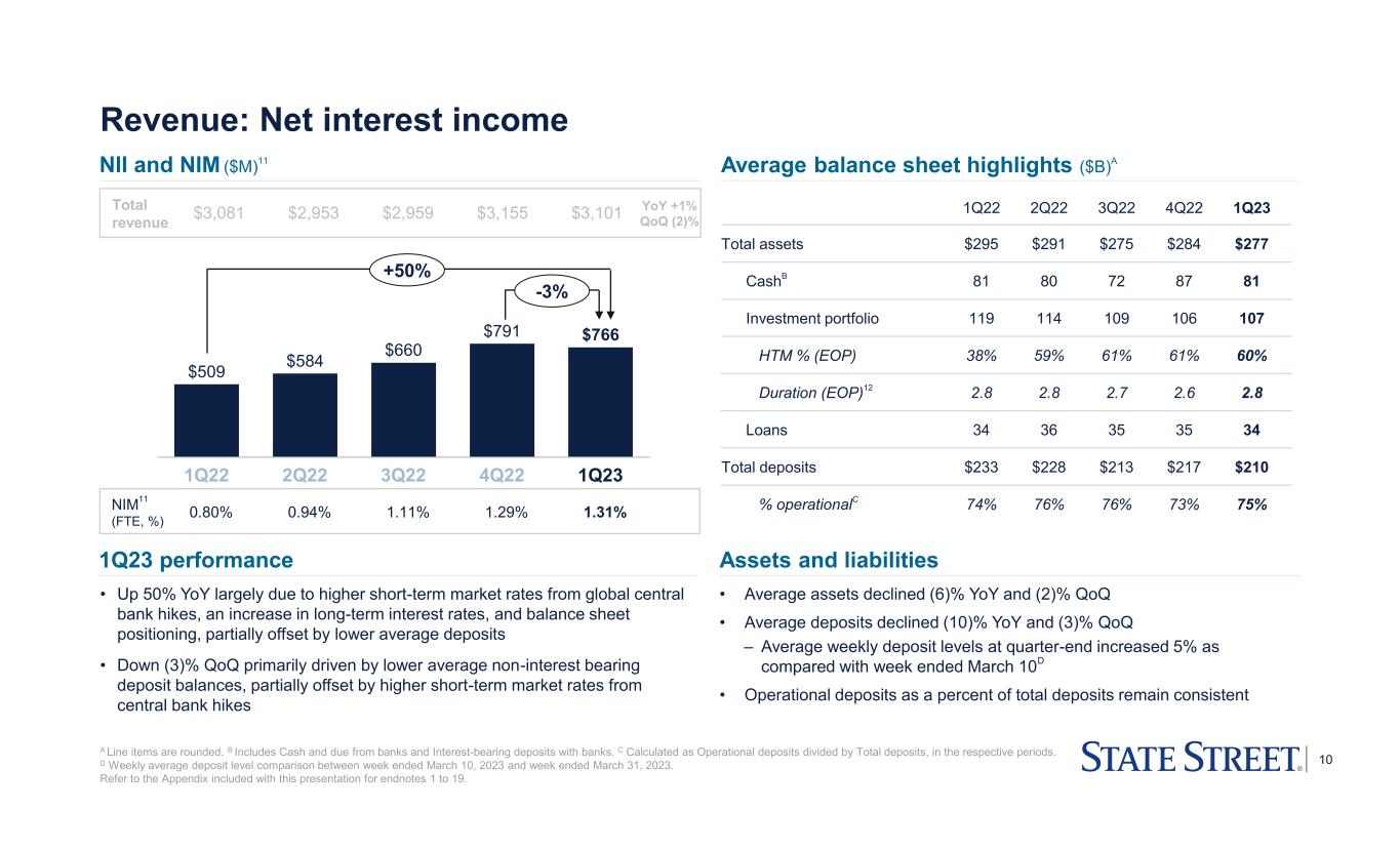 9 • 1Q23 Front office uninstalled revenue backlog up 8% YoY largely driven by new business wins in Alpha Data Platform • 1Q23 ARR increased 16% YoY driven by ~20 SaaS client implementations • Advanced the CRD Wealth strategy in APAC with the first Wealth mandate win in the region Revenue: Enterprise solutions enabled by State Street Alpha 70 74 78 81 78 29 24 20 16 22 36 25 26 59 1Q22 2Q22 3Q22 4Q22 1Q23 $138 $126 $127 $159 $109 A Front office software and data revenue primarily includes revenue from CRD, Alpha Data Platform and Alpha Data Services. Includes Other revenue of $3M in each quarter from 1Q22 through 1Q23. Revenue line items may not sum to total due to rounding. Refer to the Appendix included with this presentation for endnotes 1 to 19. -31% -21% $3,081 $2,953 $2,959 $3,155 $3,101Total revenue • Down (21)% YoY primarily driven by lower on-premises renewals and professional services revenue • Down (31)% QoQ mainly due to lower on-premises renewals, partially offset by higher professional services revenue ($M) 1Q22 4Q22 1Q23 Front office metrics New bookings8 $5 $21 $2 ARR2 235 272 273 Uninstalled revenue backlog9 93 97 100 Middle office metric Uninstalled revenue backlog10 63 104 104 Alpha metrics # of mandate wins - 2 1 Live mandates to-date 11 12 12 Professional services Software- enabled (incl. SaaS)7 On-premises7 1% YoY Growth YoY +1% QoQ (2)% Business momentum Front office software and data ($M)A Future growth driven by Front, Middle and Alpha 1Q23 performance 6