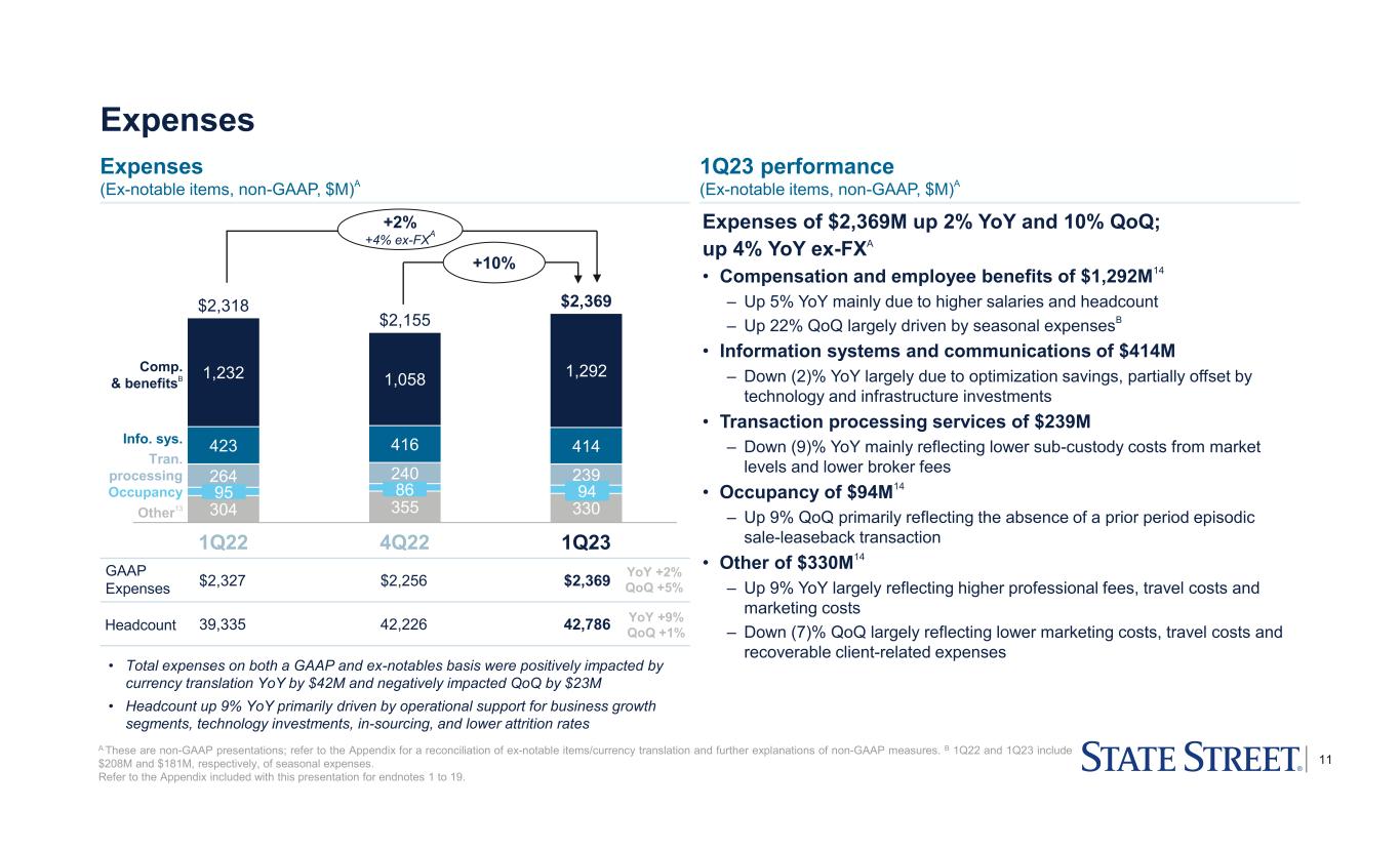 10 Revenue: Net interest income NII and NIM ($M)11 Average balance sheet highlights ($B)A A Line items are rounded. B Includes Cash and due from banks and Interest-bearing deposits with banks. C Calculated as Operational deposits divided by Total deposits, in the respective periods. D Weekly average deposit level comparison between week ended March 10, 2023 and week ended March 31, 2023. Refer to the Appendix included with this presentation for endnotes 1 to 19. 1Q22 2Q22 3Q22 4Q22 1Q23 Total assets $295 $291 $275 $284 $277 CashB 81 80 72 87 81 Investment portfolio 119 114 109 106 107 HTM % (EOP) 38% 59% 61% 61% 60% Duration (EOP)12 2.8 2.8 2.7 2.6 2.8 Loans 34 36 35 35 34 Total deposits $233 $228 $213 $217 $210 % operationalC 74% 76% 76% 73% 75% $3,081 $2,953 $2,959 $3,155 $3,101Total revenue NIM11 (FTE, %) 0.80% 0.94% 1.11% 1.29% 1.31% 1Q22 2Q22 3Q22 4Q22 1Q23 $509 $584 $660 $791 $766 -3% +50% YoY +1% QoQ (2)% • Average assets declined (6)% YoY and (2)% QoQ • Average deposits declined (10)% YoY and (3)% QoQ – Average weekly deposit levels at quarter-end increased 5% as compared with week ended March 10D • Operational deposits as a percent of total deposits remain consistent • Up 50% YoY largely due to higher short-term market rates from global central bank hikes, an increase in long-term interest rates, and balance sheet positioning, partially offset by lower average deposits • Down (3)% QoQ primarily driven by lower average non-interest bearing deposit balances, partially offset by higher short-term market rates from central bank hikes Assets and liabilities1Q23 performance