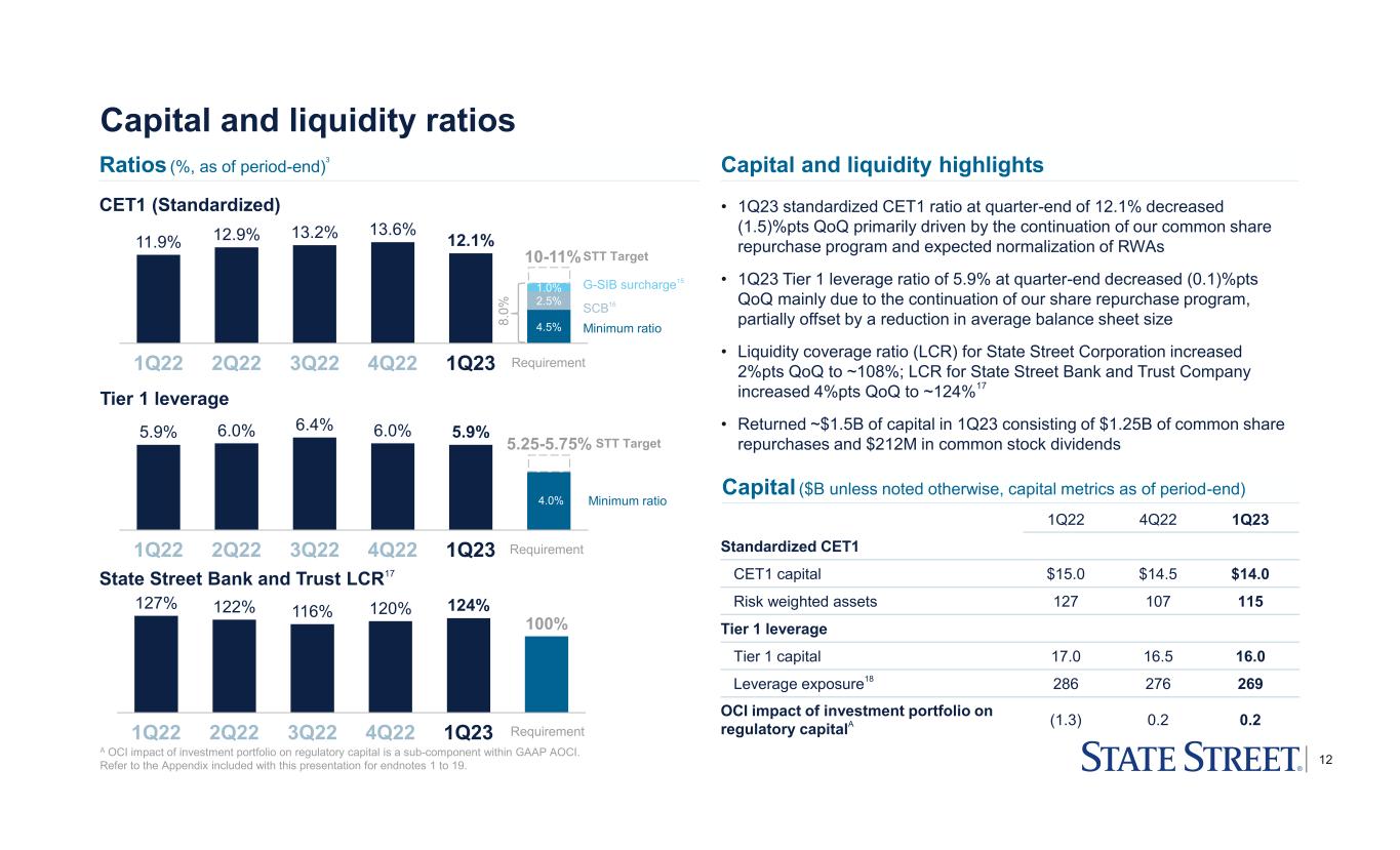 11 $2,327 $2,256 $2,369 39,335 42,226 42,786 Expenses of $2,369M up 2% YoY and 10% QoQ; up 4% YoY ex-FXA • Compensation and employee benefits of $1,292M14 – Up 5% YoY mainly due to higher salaries and headcount – Up 22% QoQ largely driven by seasonal expensesB • Information systems and communications of $414M – Down (2)% YoY largely due to optimization savings, partially offset by technology and infrastructure investments • Transaction processing services of $239M – Down (9)% YoY mainly reflecting lower sub-custody costs from market levels and lower broker fees • Occupancy of $94M14 – Up 9% QoQ primarily reflecting the absence of a prior period episodic sale-leaseback transaction • Other of $330M14 – Up 9% YoY largely reflecting higher professional fees, travel costs and marketing costs – Down (7)% QoQ largely reflecting lower marketing costs, travel costs and recoverable client-related expenses Expenses GAAP Expenses Headcount 304 355 330 264 240 239 423 416 414 1,232 1,058 1,292 1Q22 4Q22 1Q23 $2,318 $2,155 $2,369 A These are non-GAAP presentations; refer to the Appendix for a reconciliation of ex-notable items/currency translation and further explanations of non-GAAP measures. B 1Q22 and 1Q23 include $208M and $181M, respectively, of seasonal expenses. Refer to the Appendix included with this presentation for endnotes 1 to 19. Comp. & benefitsB Info. sys. Tran. processing Other13 Occupancy • Total expenses on both a GAAP and ex-notables basis were positively impacted by currency translation YoY by $42M and negatively impacted QoQ by $23M • Headcount up 9% YoY primarily driven by operational support for business growth segments, technology investments, in-sourcing, and lower attrition rates 948695 YoY +2% QoQ +5% +2% +4% ex-FXA +10% YoY +9% QoQ +1% Expenses (Ex-notable items, non-GAAP, $M)A 1Q23 performance (Ex-notable items, non-GAAP, $M)A