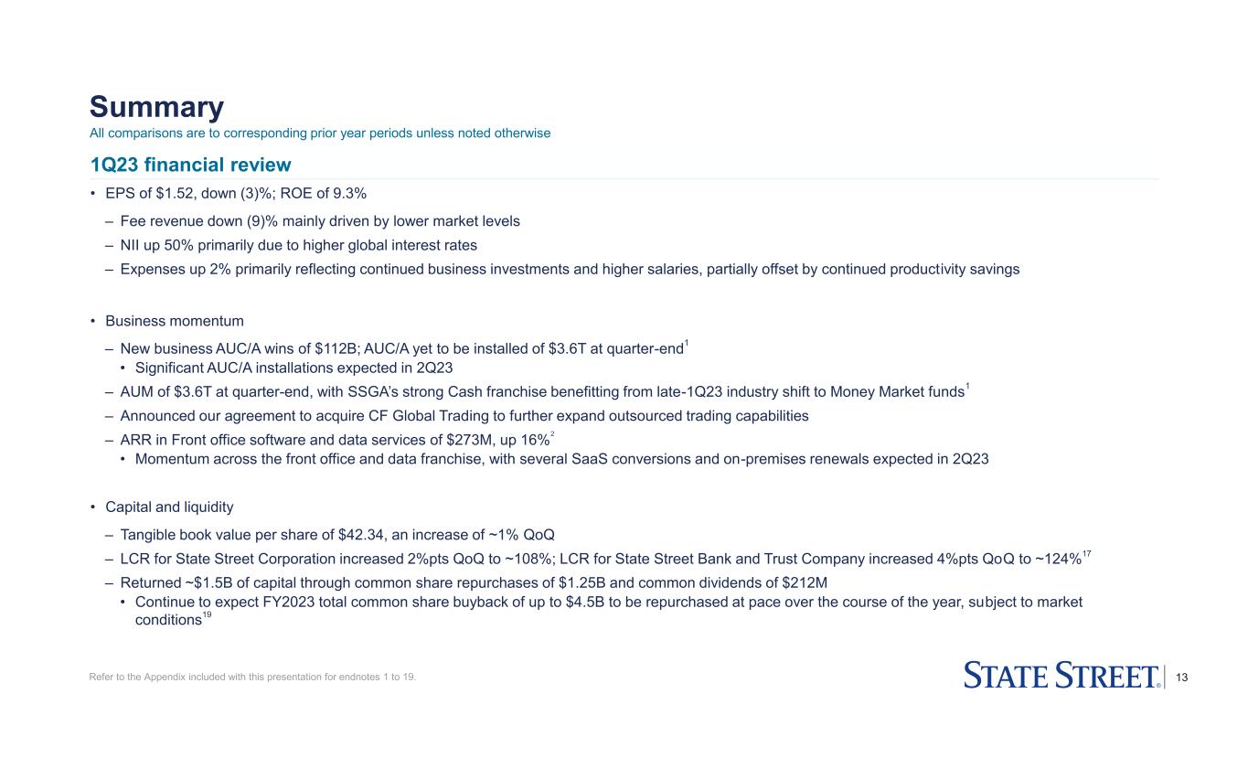 12 Capital and liquidity highlights Capital ($B unless noted otherwise, capital metrics as of period-end) Capital and liquidity ratios 1Q22 4Q22 1Q23 Standardized CET1 CET1 capital $15.0 $14.5 $14.0 Risk weighted assets 127 107 115 Tier 1 leverage Tier 1 capital 17.0 16.5 16.0 Leverage exposure18 286 276 269 OCI impact of investment portfolio on regulatory capitalA (1.3) 0.2 0.2 Tier 1 leverage 5.9% 6.0% 6.4% 6.0% 5.9% 1Q22 2Q22 3Q22 4Q22 1Q23 Minimum ratio4.0% STT Target5.25-5.75% • 1Q23 standardized CET1 ratio at quarter-end of 12.1% decreased (1.5)%pts QoQ primarily driven by the continuation of our common share repurchase program and expected normalization of RWAs • 1Q23 Tier 1 leverage ratio of 5.9% at quarter-end decreased (0.1)%pts QoQ mainly due to the continuation of our share repurchase program, partially offset by a reduction in average balance sheet size • Liquidity coverage ratio (LCR) for State Street Corporation increased 2%pts QoQ to ~108%; LCR for State Street Bank and Trust Company increased 4%pts QoQ to ~124%17 • Returned ~$1.5B of capital in 1Q23 consisting of $1.25B of common share repurchases and $212M in common stock dividends A OCI impact of investment portfolio on regulatory capital is a sub-component within GAAP AOCI. Refer to the Appendix included with this presentation for endnotes 1 to 19. CET1 (Standardized) 11.9% 12.9% 13.2% 13.6% 12.1% 4.5% 2.5% 1Q22 2Q22 3Q22 4Q22 1Q23 SCB16 Minimum ratio8. 0% 10-11% G-SIB surcharge15 STT Target 1.0% Ratios (%, as of period-end)3 127% 122% 116% 120% 124% 100% 1Q22 2Q22 3Q22 4Q22 1Q23 State Street Bank and Trust LCR17 Requirement Requirement Requirement