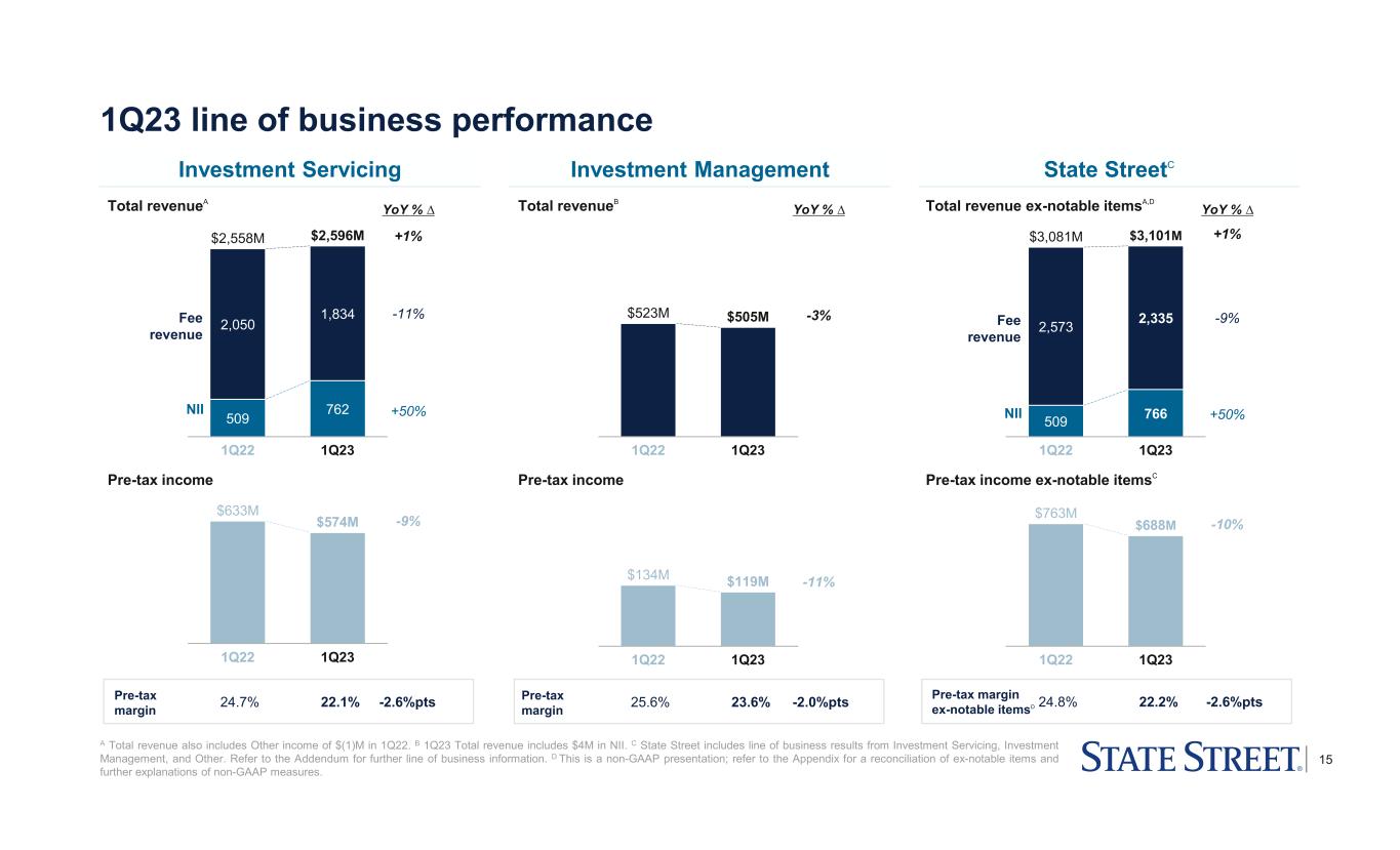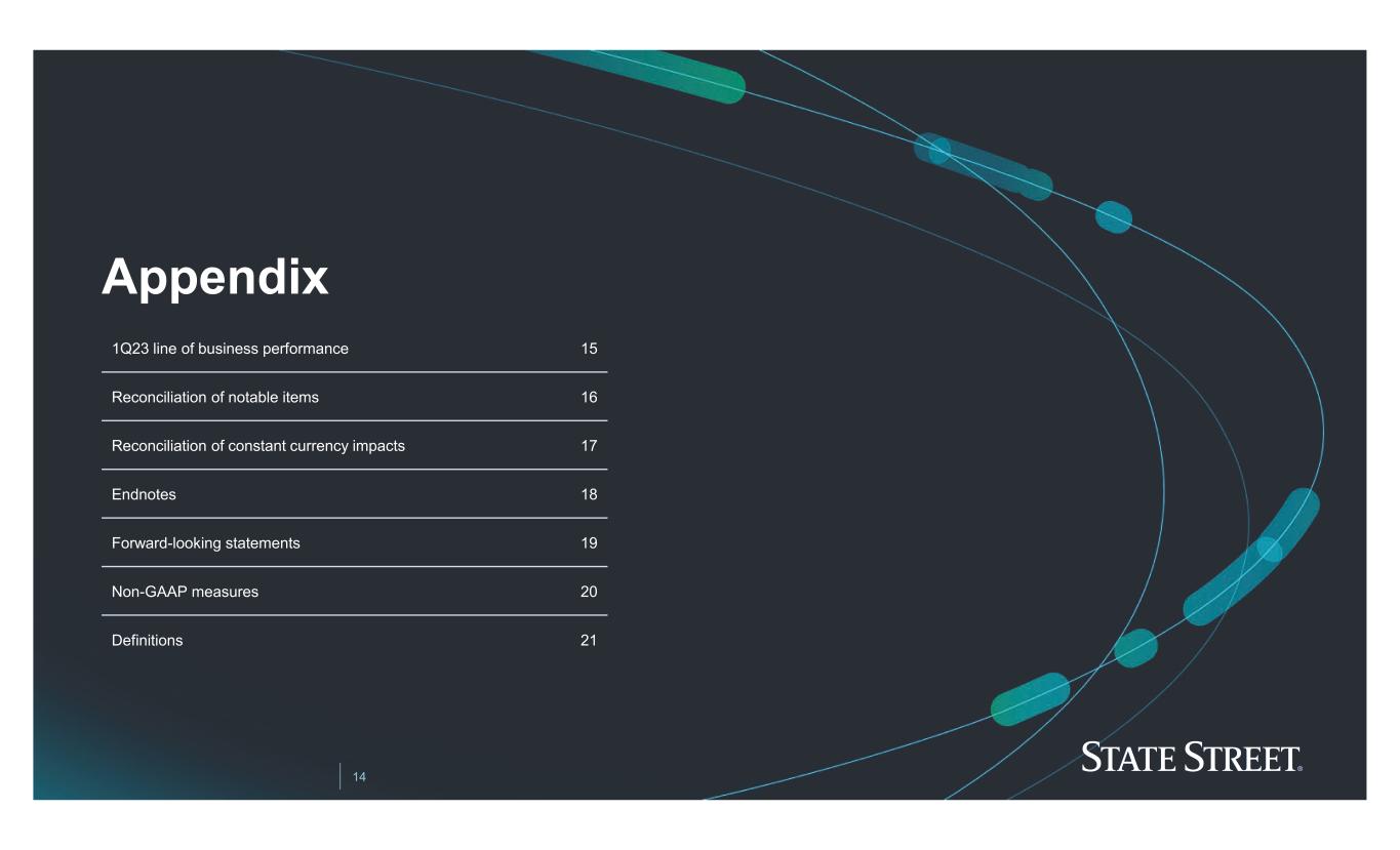 13 • EPS of $1.52, down (3)%; ROE of 9.3% – Fee revenue down (9)% mainly driven by lower market levels – NII up 50% primarily due to higher global interest rates – Expenses up 2% primarily reflecting continued business investments and higher salaries, partially offset by continued productivity savings • Business momentum – New business AUC/A wins of $112B; AUC/A yet to be installed of $3.6T at quarter-end1 • Significant AUC/A installations expected in 2Q23 – AUM of $3.6T at quarter-end, with SSGA’s strong Cash franchise benefitting from late-1Q23 industry shift to Money Market funds1 – Announced our agreement to acquire CF Global Trading to further expand outsourced trading capabilities – ARR in Front office software and data services of $273M, up 16%2 • Momentum across the front office and data franchise, with several SaaS conversions and on-premises renewals expected in 2Q23 • Capital and liquidity – Tangible book value per share of $42.34, an increase of ~1% QoQ – LCR for State Street Corporation increased 2%pts QoQ to ~108%; LCR for State Street Bank and Trust Company increased 4%pts QoQ to ~124%17 – Returned ~$1.5B of capital through common share repurchases of $1.25B and common dividends of $212M • Continue to expect FY2023 total common share buyback of up to $4.5B to be repurchased at pace over the course of the year, subject to market conditions19 Summary 1Q23 financial review All comparisons are to corresponding prior year periods unless noted otherwise Refer to the Appendix included with this presentation for endnotes 1 to 19.