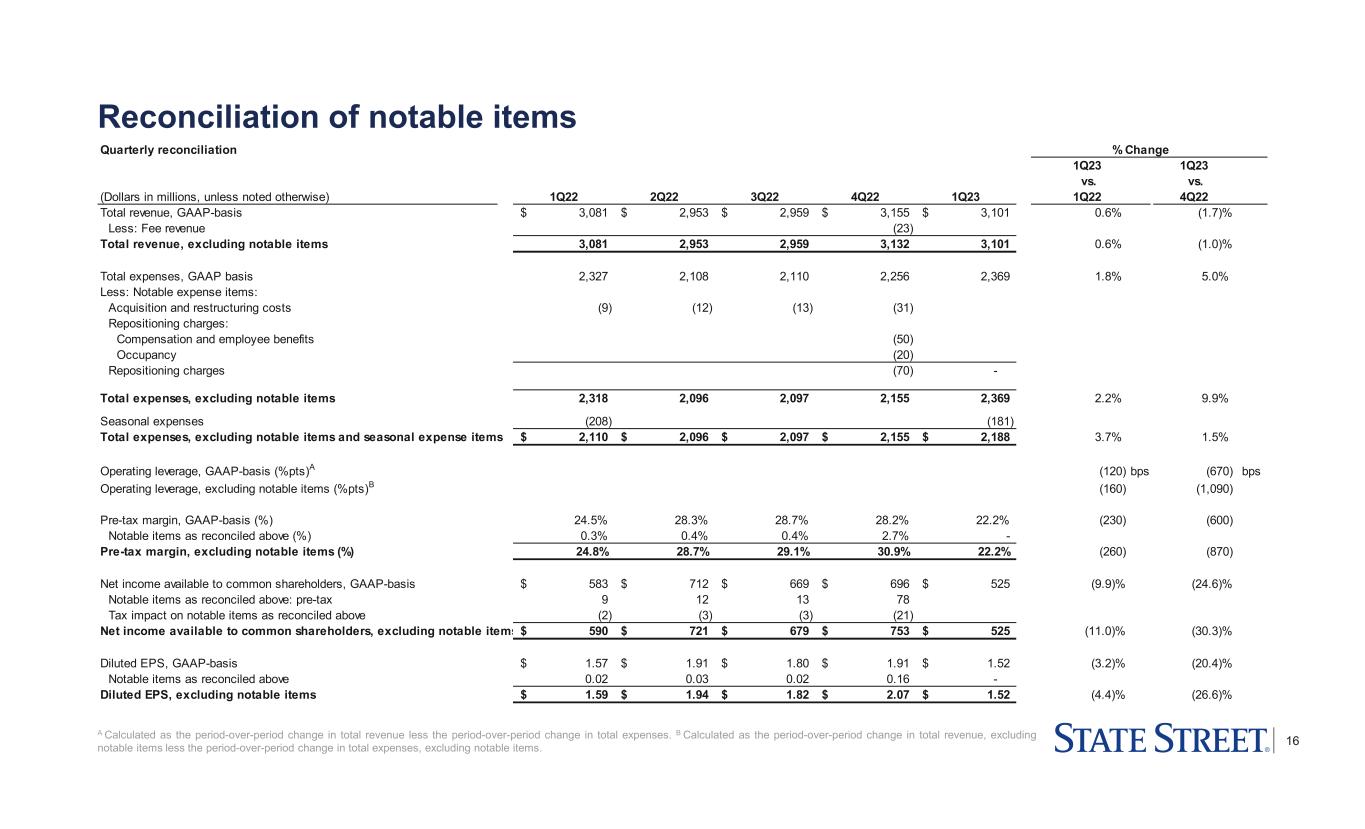 15 1,834 State StreetC 1Q23 line of business performance Investment Servicing Total revenueA 509 762 2,050 1,834 1Q22 1Q23 $2,596M$2,558M Pre-tax income Fee revenue NII Pre-tax margin 24.7% 22.1% -2.6%pts YoY % ∆ -11% +50% +1% -9% Investment Management Total revenueB 1Q22 1Q23 $505M$523M Pre-tax income Pre-tax margin 25.6% 23.6% -2.0%pts 1Q22 1Q23 $134M $119M YoY % ∆ -3% -11% Total revenue ex-notable itemsA,D 509 766 2,573 2,335 1Q22 $3,081M 1Q23 $3,101M Pre-tax income ex-notable itemsC Fee revenue NII Pre-tax margin ex-notable itemsD 24.8% 22.2% -2.6%pts YoY % ∆ -9% +50% +1% -10% A Total revenue also includes Other income of $(1)M in 1Q22. B 1Q23 Total revenue includes $4M in NII. C State Street includes line of business results from Investment Servicing, Investment Management, and Other. Refer to the Addendum for further line of business information. D This is a non-GAAP presentation; refer to the Appendix for a reconciliation of ex-notable items and further explanations of non-GAAP measures. $574M 1Q22 1Q23 $633M 1Q22 1Q23 $688M $763M