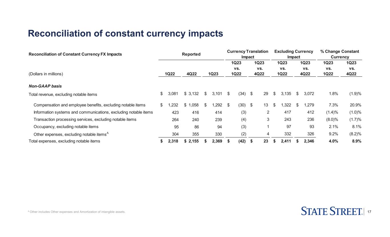 16 Reconciliation of notable items A Calculated as the period-over-period change in total revenue less the period-over-period change in total expenses. B Calculated as the period-over-period change in total revenue, excluding notable items less the period-over-period change in total expenses, excluding notable items. Quarterly reconciliation (Dollars in millions, unless noted otherwise) 1Q22 2Q22 3Q22 4Q22 1Q23 1Q23 vs. 1Q22 1Q23 vs. 4Q22 Total revenue, GAAP-basis 3,081$ 2,953$ 2,959$ 3,155$ 3,101$ 0.6% (1.7)% Less: Fee revenue (23) Total revenue, excluding notable items 3,081 2,953 2,959 3,132 3,101 0.6% (1.0)% Total expenses, GAAP basis 2,327 2,108 2,110 2,256 2,369 1.8% 5.0% Less: Notable expense items: Acquisition and restructuring costs (9) (12) (13) (31) Repositioning charges: Compensation and employee benefits (50) Occupancy (20) Repositioning charges (70) - Total expenses, excluding notable items 2,318 2,096 2,097 2,155 2,369 2.2% 9.9% Seasonal expenses (208) (181) Total expenses, excluding notable items and seasonal expense items 2,110$ 2,096$ 2,097$ 2,155$ 2,188$ 3.7% 1.5% Operating leverage, GAAP-basis (%pts)A (120) bps (670) bps Operating leverage, excluding notable items (%pts)B (160) (1,090) Pre-tax margin, GAAP-basis (%) 24.5% 28.3% 28.7% 28.2% 22.2% (230) (600) Notable items as reconciled above (%) 0.3% 0.4% 0.4% 2.7% - Pre-tax margin, excluding notable items (%) 24.8% 28.7% 29.1% 30.9% 22.2% (260) (870) Net income available to common shareholders, GAAP-basis 583$ 712$ 669$ 696$ 525$ (9.9)% (24.6)% Notable items as reconciled above: pre-tax 9 12 13 78 Tax impact on notable items as reconciled above (2) (3) (3) (21) Net income available to common shareholders, excluding notable items 590$ 721$ 679$ 753$ 525$ (11.0)% (30.3)% Diluted EPS, GAAP-basis 1.57$ 1.91$ 1.80$ 1.91$ 1.52$ (3.2)% (20.4)% Notable items as reconciled above 0.02 0.03 0.02 0.16 - Diluted EPS, excluding notable items 1.59$ 1.94$ 1.82$ 2.07$ 1.52$ (4.4)% (26.6)% % Change