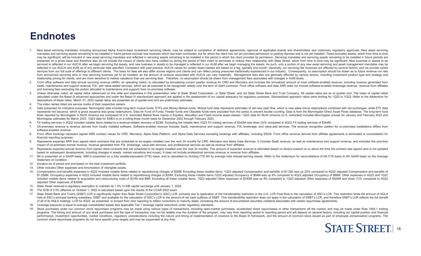 17 Reconciliation of constant currency impacts A Other includes Other expenses and Amortization of intangible assets. Reconciliation of Constant Currency FX Impacts (Dollars in millions) 1Q22 4Q22 1Q23 1Q23 vs. 1Q22 1Q23 vs. 4Q22 1Q23 vs. 1Q22 1Q23 vs. 4Q22 1Q23 vs. 1Q22 1Q23 vs. 4Q22 Non-GAAP basis Total revenue, excluding notable items $ 3,081 $ 3,132 $ 3,101 $ (34) $ 29 $ 3,135 $ 3,072 1.8% (1.9)% Compensation and employee benefits, excluding notable items $ 1,232 $ 1,058 $ 1,292 $ (30) $ 13 $ 1,322 $ 1,279 7.3% 20.9% Information systems and communications, excluding notable items 423 416 414 (3) 2 417 412 (1.4)% (1.0)% Transaction processing services, excluding notable items 264 240 239 (4) 3 243 236 (8.0)% (1.7)% Occupancy, excluding notable items 95 86 94 (3) 1 97 93 2.1% 8.1% Other expenses, excluding notable itemsA 304 355 330 (2) 4 332 326 9.2% (8.2)% Total expenses, excluding notable items $ 2,318 $ 2,155 $ 2,369 $ (42) $ 23 $ 2,411 $ 2,346 4.0% 8.9% Reported Currency Translation Impact Excluding Currency Impact % Change Constant Currency