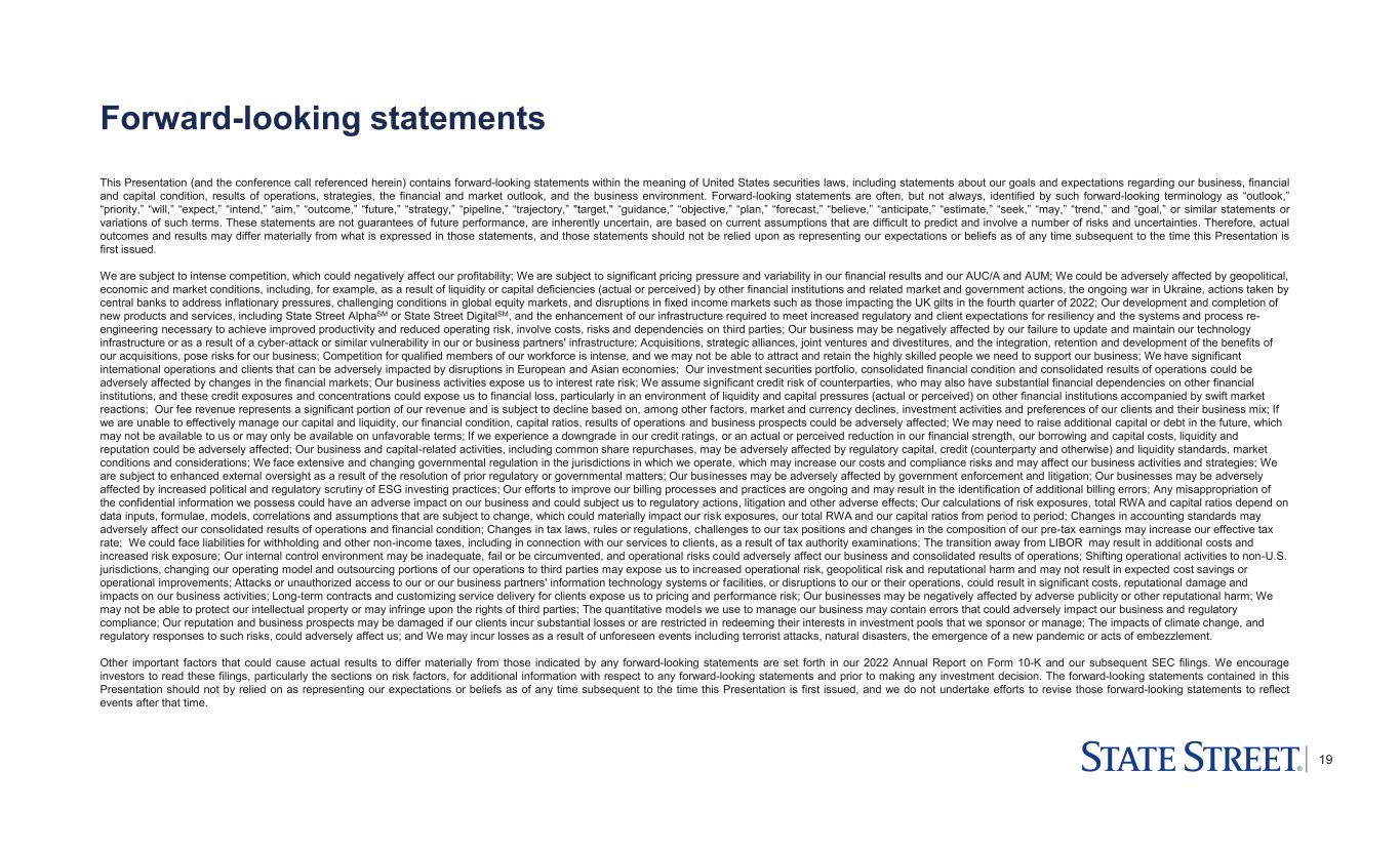 18 Endnotes 1. New asset servicing mandates, including announced Alpha front-to-back investment servicing clients, may be subject to completion of definitive agreements, approval of applicable boards and shareholders and customary regulatory approvals. New asset servicing mandates and servicing assets remaining to be installed in future periods exclude new business which has been contracted, but for which the client has not yet provided permission to publicly disclose and is not yet installed. These excluded assets, which from time to time may be significant, will be included in new asset servicing mandates and reflected in servicing assets remaining to be installed in the period in which the client provides its permission. Servicing mandates and servicing assets remaining to be installed in future periods are presented on a gross basis and therefore also do not include the impact of clients who have notified us during the period of their intent to terminate or reduce their relationship with State Street, which from time to time may be significant. New business in assets to be serviced is reflected in our AUC/A after we begin servicing the assets, and new business in assets to be managed is reflected in our AUM after we begin managing the assets. As such, only a portion of any new asset servicing and asset management mandates may be reflected in our AUC/A and AUM as of any particular date specified. Consistent with past practice, AUC/A values for certain asset classes are based on a lag, typically one-month. Generally, our servicing fee revenues are affected by several factors, and we provide varied services from our full suite of offerings to different clients. The basis for fees will also differ across regions and clients and can reflect pricing pressures traditionally experienced in our industry. Consequently, no assumption should be drawn as to future revenue run rate from announced servicing wins or new servicing business yet to be installed, as the amount of revenue associated with AUC/A can vary materially. Management fees also are generally affected by various factors, including investment product type and strategy and relationship pricing for clients, and are more sensitive to market valuations than are servicing fees. Therefore, no assumption should be drawn from management fees associated with changes in AUM levels. 2. Front office software and data annual recurring revenue (ARR), an operating metric, is calculated by annualizing current quarter revenue for CRD and Mercatus and includes the annualized amount of most software-enabled revenue, including revenue generated from SaaS, maintenance and support revenue, FIX, and value-added services, which are all expected to be recognized ratably over the term of client contracts. Front office software and data ARR does not include software-enabled brokerage revenue, revenue from affiliates and licensing fees (excluding the portion allocated to maintenance and support) from on-premises software. 3. Unless otherwise noted, all capital ratios referenced on this slide and elsewhere in this presentation refer to State Street Corporation, or State Street, and not State Street Bank and Trust Company. All capital ratios are as of quarter end. The lower of capital ratios calculated under the Basel III advanced approaches and under the Basel III standardized approach are applied in the assessment of our capital adequacy for regulatory purposes. Standardized approach ratios were binding for 1Q22 to 1Q23. Refer to the Addendum for descriptions of these ratios. March 31, 2023 capital ratios are presented as of quarter-end and are preliminary estimates. 4. The index names listed are service marks of their respective owners. 5. Data presented for indicative purposes. Morningstar data includes long-term mutual funds, ETFs and Money Market funds. Mutual fund data represents estimates of net new cash flow, which is new sales minus redemptions combined with net exchanges, while ETF data represents net issuance, which is gross issuance less gross redemptions. Data for Fund of Funds, Feeder funds and Obsolete funds were excluded from the series to prevent double counting. Data is from the Morningstar Direct Asset Flows database. The long-term fund flows reported by Morningstar in North America are composed of U.S. domiciled Market flows mainly in Equities, Allocation and Fixed Income asset classes. 1Q23 data for North America (U.S. domiciled) includes Morningstar actuals for January and February 2023 and Morningstar estimates for March 2023. 1Q23 data for EMEA is on a rolling three month basis for December 2022 through February 2023. 6. FX trading services in 4Q22 included notable items related to a revenue-related recovery of $23M. Excluding the notable item,1Q23 FX trading services of $342M was down (5)% compared to 4Q22 FX trading services of $344M. 7. On-premises revenue is revenue derived from locally installed software. Software-enabled revenue includes SaaS, maintenance and support revenue, FIX, brokerage, and value-add services. The revenue recognition pattern for on-premises installations differs from software-enabled revenue. 8. Front office bookings represent signed ARR contract values for CRD, Mercatus, Alpha Data Platform, and Alpha Data Services excluding bookings with affiliates, including SSGA. Front office revenue derived from affiliate agreements is eliminated in consolidation for financial reporting purposes. 9. Represents expected ARR from signed client contracts that are scheduled to be largely installed over the next 24 months for CRD, Mercatus and Alpha Data Services. It includes SaaS revenue, as well as maintenance and support revenue, and excludes the one-time impact of on-premises license revenue, revenue generated from FIX, brokerage, value-add services, and professional services as well as revenue from affiliates. 10. Represents expected annual revenue from signed client contracts that are scheduled to be largely installed ov