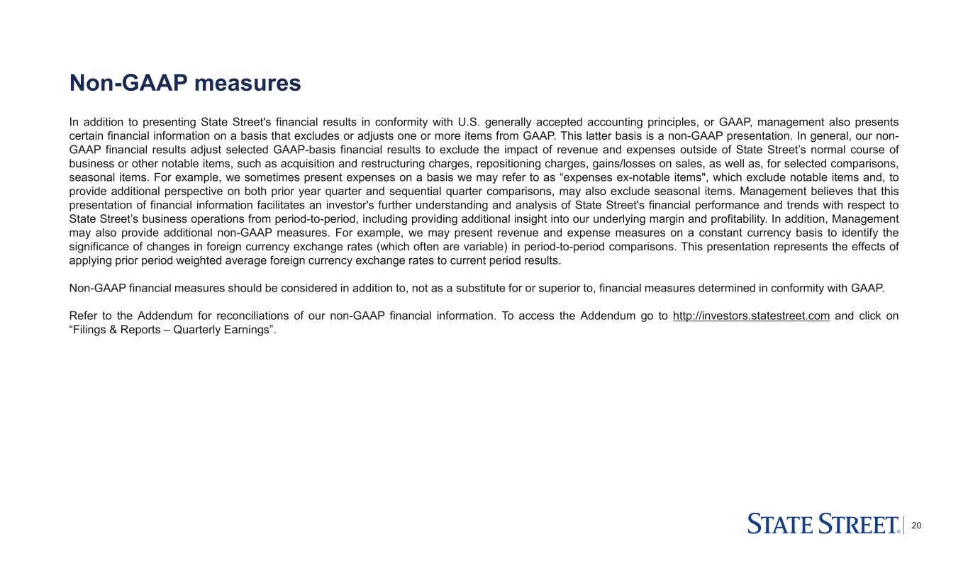 19 Forward-looking statements This Presentation (and the conference call referenced herein) contains forward-looking statements within the meaning of United States securities laws, including statements about our goals and expectations regarding our business, financial and capital condition, results of operations, strategies, the financial and market outlook, and the business environment. Forward-looking statements are often, but not always, identified by such forward-looking terminology as “outlook,” “priority,” “will,” “expect,” “intend,” “aim,” “outcome,” “future,” “strategy,” “pipeline,” “trajectory,” "target," “guidance,” “objective,” “plan,” “forecast,” “believe,” “anticipate,” “estimate,” “seek,” “may,” “trend,” and “goal,” or similar statements or variations of such terms. These statements are not guarantees of future performance, are inherently uncertain, are based on current assumptions that are difficult to predict and involve a number of risks and uncertainties. Therefore, actual outcomes and results may differ materially from what is expressed in those statements, and those statements should not be relied upon as representing our expectations or beliefs as of any time subsequent to the time this Presentation is first issued. We are subject to intense competition, which could negatively affect our profitability; We are subject to significant pricing pressure and variability in our financial results and our AUC/A and AUM; We could be adversely affected by geopolitical, economic and market conditions, including, for example, as a result of liquidity or capital deficiencies (actual or perceived) by other financial institutions and related market and government actions, the ongoing war in Ukraine, actions taken by central banks to address inflationary pressures, challenging conditions in global equity markets, and disruptions in fixed income markets such as those impacting the UK gilts in the fourth quarter of 2022; Our development and completion of new products and services, including State Street AlphaSM or State Street DigitalSM, and the enhancement of our infrastructure required to meet increased regulatory and client expectations for resiliency and the systems and process re- engineering necessary to achieve improved productivity and reduced operating risk, involve costs, risks and dependencies on third parties; Our business may be negatively affected by our failure to update and maintain our technology infrastructure or as a result of a cyber-attack or similar vulnerability in our or business partners' infrastructure; Acquisitions, strategic alliances, joint ventures and divestitures, and the integration, retention and development of the benefits of our acquisitions, pose risks for our business; Competition for qualified members of our workforce is intense, and we may not be able to attract and retain the highly skilled people we need to support our business; We have significant international operations and clients that can be adversely impacted by disruptions in European and Asian economies; Our investment securities portfolio, consolidated financial condition and consolidated results of operations could be adversely affected by changes in the financial markets; Our business activities expose us to interest rate risk; We assume significant credit risk of counterparties, who may also have substantial financial dependencies on other financial institutions, and these credit exposures and concentrations could expose us to financial loss, particularly in an environment of liquidity and capital pressures (actual or perceived) on other financial institutions accompanied by swift market reactions; Our fee revenue represents a significant portion of our revenue and is subject to decline based on, among other factors, market and currency declines, investment activities and preferences of our clients and their business mix; If we are unable to effectively manage our capital and liquidity, our financial condition, capital ratios, results of operations and business prospects could be adversely affected; We may need to raise additional capital or debt in the future, which may not be available to us or may only be available on unfavorable terms; If we experience a downgrade in our credit ratings, or an actual or perceived reduction in our financial strength, our borrowing and capital costs, liquidity and reputation could be adversely affected; Our business and capital-related activities, including common share repurchases, may be adversely affected by regulatory capital, credit (counterparty and otherwise) and liquidity standards, market conditions and considerations; We face extensive and changing governmental regulation in the jurisdictions in which we operate, which may increase our costs and compliance risks and may affect our business activities and strategies; We are subject to enhanced external oversight as a result of the resolution of prior regulatory or governmental matters; Our businesses may be adversely affected by government enforcement and litigation; Our businesses may be adversely affected by increased political and regulatory scrutiny of ESG investing practices; Our efforts to improve our billing processes and practices are ongoing and may result in the identification of additional billing errors; Any misappropriation of the confidential information we possess could have an adverse impact on our business and could subject us to regulatory actions, litigation and other adverse effects; Our calculations of risk exposures, total RWA and capital ratios depend on data inputs, formulae, models, correlations and assumptions that are subject to change, which could materially impact our risk exposures, our total RWA and our capital ratios from period to period; Changes in accounting standards may adversely affect our consolidated results of operations and financial condition; Changes in tax la