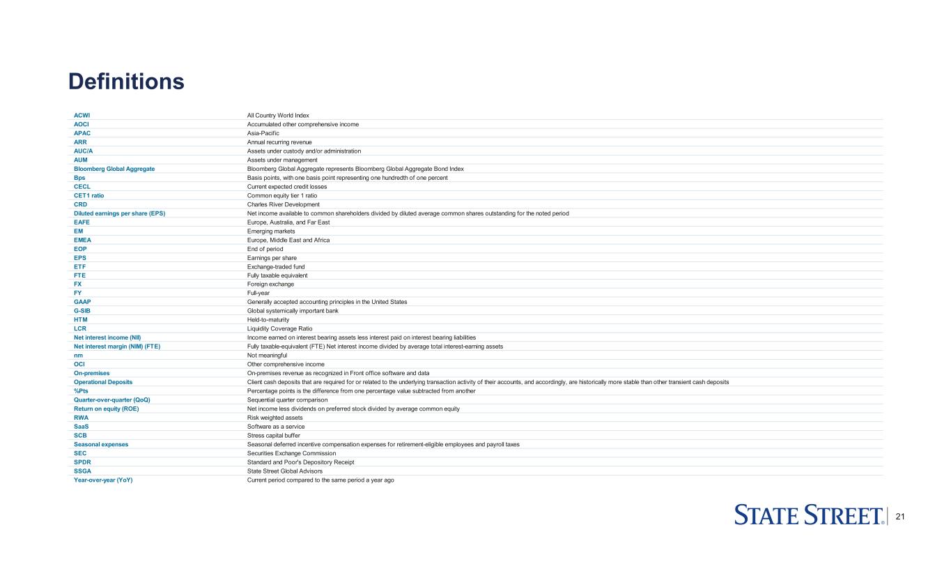 20 Non-GAAP measures In addition to presenting State Street's financial results in conformity with U.S. generally accepted accounting principles, or GAAP, management also presents certain financial information on a basis that excludes or adjusts one or more items from GAAP. This latter basis is a non-GAAP presentation. In general, our non- GAAP financial results adjust selected GAAP-basis financial results to exclude the impact of revenue and expenses outside of State Street’s normal course of business or other notable items, such as acquisition and restructuring charges, repositioning charges, gains/losses on sales, as well as, for selected comparisons, seasonal items. For example, we sometimes present expenses on a basis we may refer to as “expenses ex-notable items", which exclude notable items and, to provide additional perspective on both prior year quarter and sequential quarter comparisons, may also exclude seasonal items. Management believes that this presentation of financial information facilitates an investor's further understanding and analysis of State Street's financial performance and trends with respect to State Street’s business operations from period-to-period, including providing additional insight into our underlying margin and profitability. In addition, Management may also provide additional non-GAAP measures. For example, we may present revenue and expense measures on a constant currency basis to identify the significance of changes in foreign currency exchange rates (which often are variable) in period-to-period comparisons. This presentation represents the effects of applying prior period weighted average foreign currency exchange rates to current period results. Non-GAAP financial measures should be considered in addition to, not as a substitute for or superior to, financial measures determined in conformity with GAAP. Refer to the Addendum for reconciliations of our non-GAAP financial information. To access the Addendum go to http://investors.statestreet.com and click on “Filings & Reports – Quarterly Earnings”.