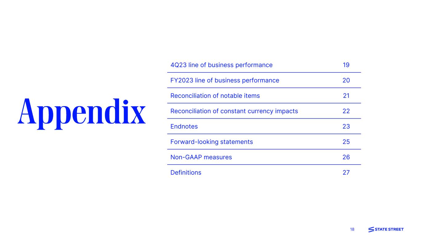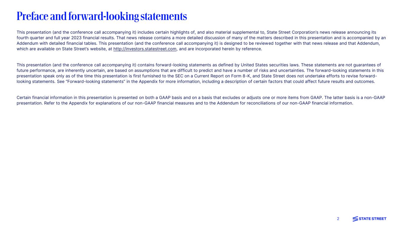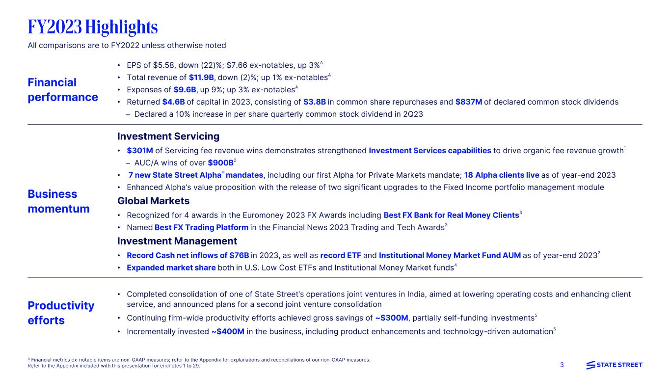 2 This presentation (and the conference call accompanying it) includes certain highlights of, and also material supplemental to, State Street Corporation’s news release announcing its fourth quarter and full year 2023 financial results. That news release contains a more detailed discussion of many of the matters described in this presentation and is accompanied by an Addendum with detailed financial tables. This presentation (and the conference call accompanying it) is designed to be reviewed together with that news release and that Addendum, which are available on State Street’s website, at http://investors.statestreet.com, and are incorporated herein by reference. This presentation (and the conference call accompanying it) contains forward-looking statements as defined by United States securities laws. These statements are not guarantees of future performance, are inherently uncertain, are based on assumptions that are difficult to predict and have a number of risks and uncertainties. The forward-looking statements in this presentation speak only as of the time this presentation is first furnished to the SEC on a Current Report on Form 8-K, and State Street does not undertake efforts to revise forward- looking statements. See “Forward-looking statements” in the Appendix for more information, including a description of certain factors that could affect future results and outcomes. Certain financial information in this presentation is presented on both a GAAP basis and on a basis that excludes or adjusts one or more items from GAAP. The latter basis is a non-GAAP presentation. Refer to the Appendix for explanations of our non-GAAP financial measures and to the Addendum for reconciliations of our non-GAAP financial information.