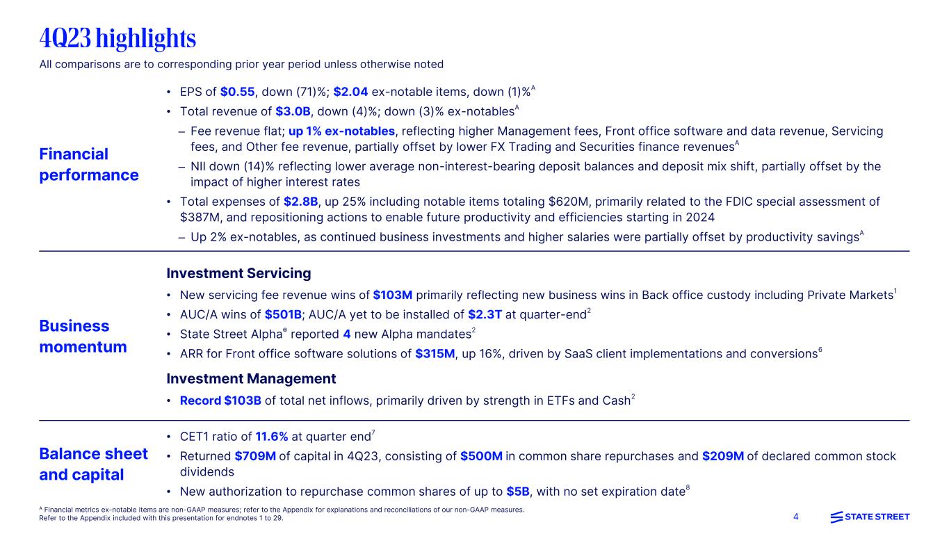 3 Financial performance • EPS of $5.58, down (22)%; $7.66 ex-notables, up 3%A • Total revenue of $11.9B, down (2)%; up 1% ex-notablesA • Expenses of $9.6B, up 9%; up 3% ex-notablesA • Returned $4.6B of capital in 2023, consisting of $3.8B in common share repurchases and $837M of declared common stock dividends – Declared a 10% increase in per share quarterly common stock dividend in 2Q23 Business momentum Investment Servicing • $301M of Servicing fee revenue wins demonstrates strengthened Investment Services capabilities to drive organic fee revenue growth1 – AUC/A wins of over $900B2 • 7 new State Street Alpha® mandates, including our first Alpha for Private Markets mandate; 18 Alpha clients live as of year-end 2023 • Enhanced Alpha’s value proposition with the release of two significant upgrades to the Fixed Income portfolio management module Global Markets • Recognized for 4 awards in the Euromoney 2023 FX Awards including Best FX Bank for Real Money Clients3 • Named Best FX Trading Platform in the Financial News 2023 Trading and Tech Awards3 Investment Management • Record Cash net inflows of $76B in 2023, as well as record ETF and Institutional Money Market Fund AUM as of year-end 20232 • Expanded market share both in U.S. Low Cost ETFs and Institutional Money Market funds4 Productivity efforts • Completed consolidation of one of State Street’s operations joint ventures in India, aimed at lowering operating costs and enhancing client service, and announced plans for a second joint venture consolidation • Continuing firm-wide productivity efforts achieved gross savings of ~$300M, partially self-funding investments5 • Incrementally invested ~$400M in the business, including product enhancements and technology-driven automation5 All comparisons are to FY2022 unless otherwise noted A Financial metrics ex-notable items are non-GAAP measures; refer to the Appendix for explanations and reconciliations of our non-GAAP measures. Refer to the Appendix included with this presentation for endnotes 1 to 29.