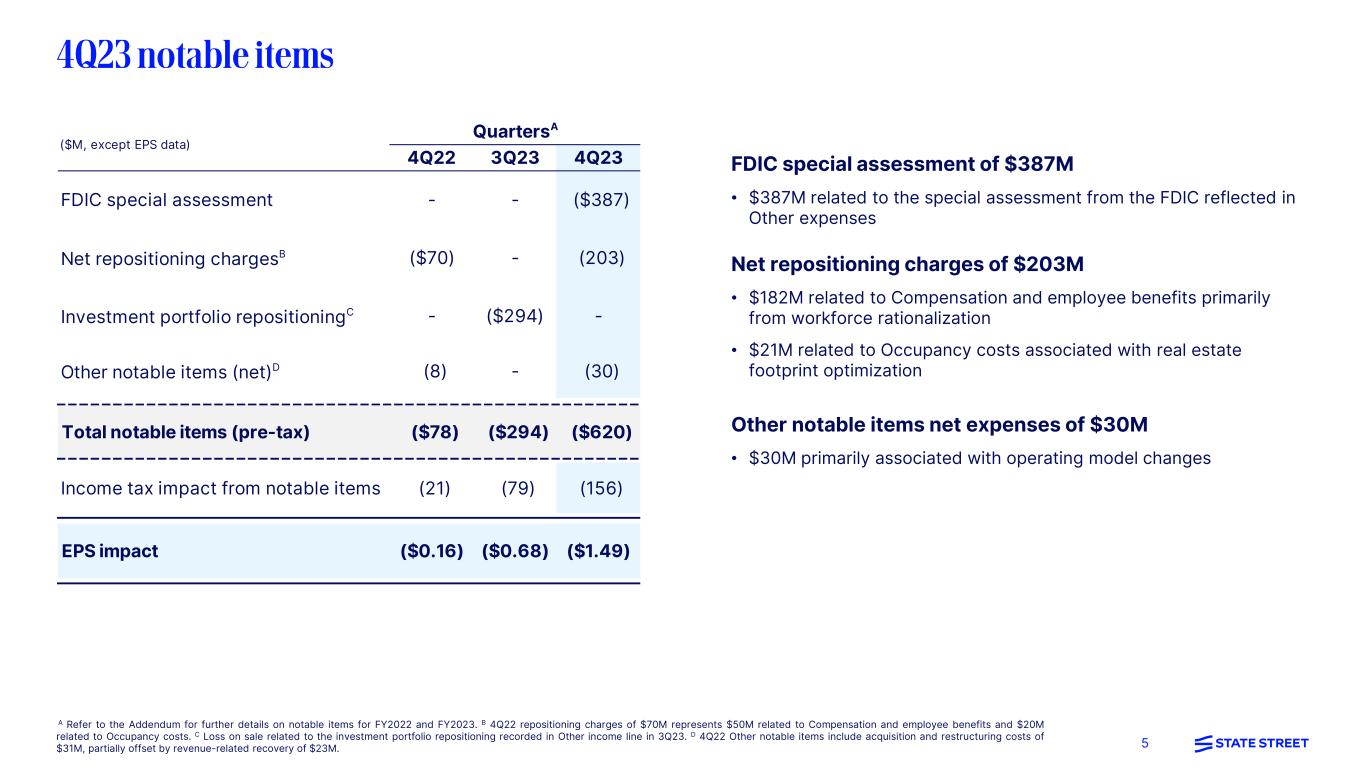 4 All comparisons are to corresponding prior year period unless otherwise noted Financial performance • EPS of $0.55, down (71)%; $2.04 ex-notable items, down (1)%A • Total revenue of $3.0B, down (4)%; down (3)% ex-notablesA – Fee revenue flat; up 1% ex-notables, reflecting higher Management fees, Front office software and data revenue, Servicing fees, and Other fee revenue, partially offset by lower FX Trading and Securities finance revenuesA – NII down (14)% reflecting lower average non-interest-bearing deposit balances and deposit mix shift, partially offset by the impact of higher interest rates • Total expenses of $2.8B, up 25% including notable items totaling $620M, primarily related to the FDIC special assessment of $387M, and repositioning actions to enable future productivity and efficiencies starting in 2024 – Up 2% ex-notables, as continued business investments and higher salaries were partially offset by productivity savingsA Business momentum Investment Servicing • New servicing fee revenue wins of $103M primarily reflecting new business wins in Back office custody including Private Markets1 • AUC/A wins of $501B; AUC/A yet to be installed of $2.3T at quarter-end2 • State Street Alpha® reported 4 new Alpha mandates2 • ARR for Front office software solutions of $315M, up 16%, driven by SaaS client implementations and conversions6 Investment Management • Record $103B of total net inflows, primarily driven by strength in ETFs and Cash2 Balance sheet and capital • CET1 ratio of 11.6% at quarter end7 • Returned $709M of capital in 4Q23, consisting of $500M in common share repurchases and $209M of declared common stock dividends • New authorization to repurchase common shares of up to $5B, with no set expiration date8 A Financial metrics ex-notable items are non-GAAP measures; refer to the Appendix for explanations and reconciliations of our non-GAAP measures. Refer to the Appendix included with this presentation for endnotes 1 to 29.