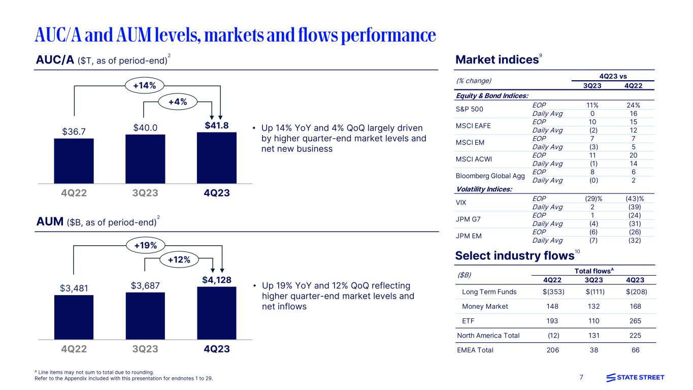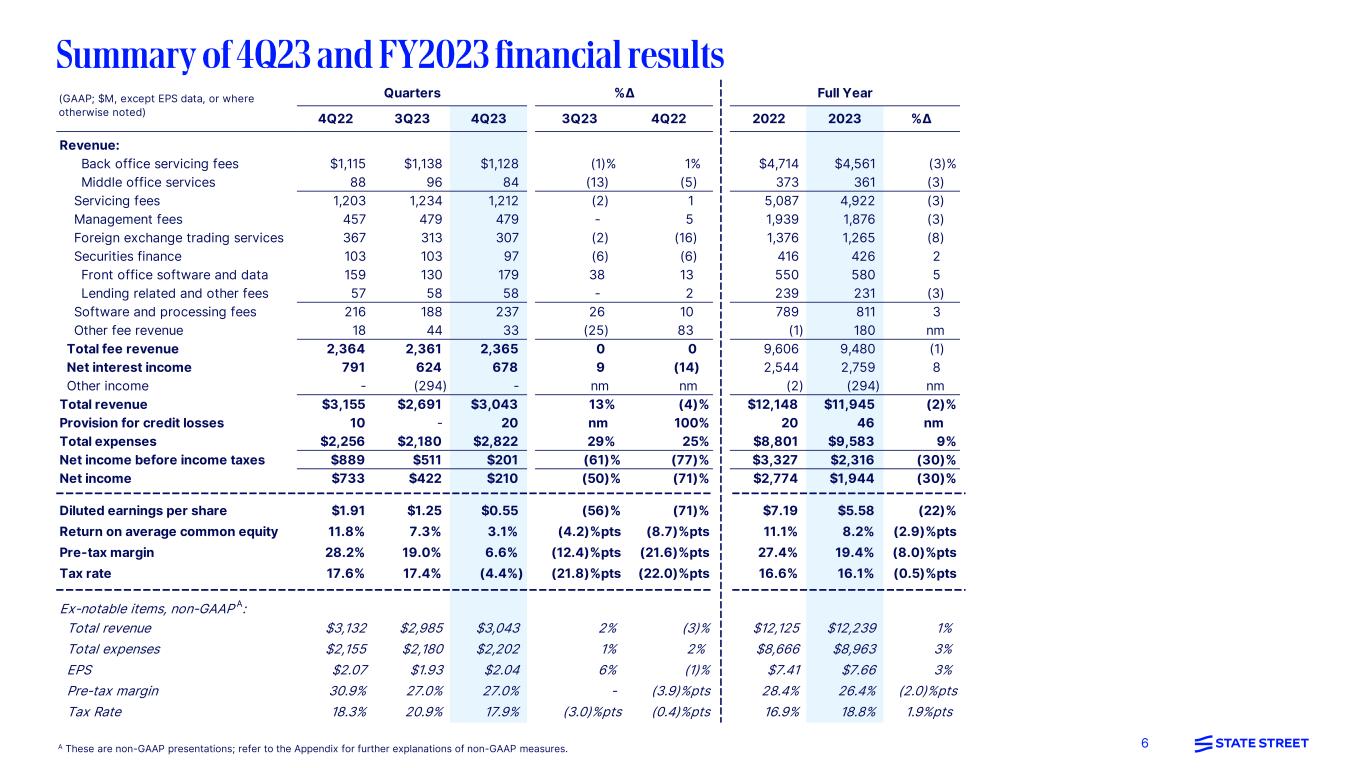 6A These are non-GAAP presentations; refer to the Appendix for further explanations of non-GAAP measures. 4Q22 3Q23 4Q23 3Q23 4Q22 2022 2023 %∆ Revenue: Back office servicing fees $1,115 $1,138 $1,128 (1)% 1% $4,714 $4,561 (3)% Middle office services 88 96 84 (13) (5) 373 361 (3) Servicing fees 1,203 1,234 1,212 (2) 1 5,087 4,922 (3) Management fees 457 479 479 - 5 1,939 1,876 (3) Foreign exchange trading services 367 313 307 (2) (16) 1,376 1,265 (8) Securities finance 103 103 97 (6) (6) 416 426 2 Front office software and data 159 130 179 38 13 550 580 5 Lending related and other fees 57 58 58 - 2 239 231 (3) Software and processing fees 216 188 237 26 10 789 811 3 Other fee revenue 18 44 33 (25) 83 (1) 180 nm Total fee revenue 2,364 2,361 2,365 0 0 9,606 9,480 (1) Net interest income 791 624 678 9 (14) 2,544 2,759 8 Other income - (294) - nm nm (2) (294) nm Total revenue $3,155 $2,691 $3,043 13% (4)% $12,148 $11,945 (2)% Provision for credit losses 10 - 20 nm 100% 20 46 nm Total expenses $2,256 $2,180 $2,822 29% 25% $8,801 $9,583 9% Net income before income taxes $889 $511 $201 (61)% (77)% $3,327 $2,316 (30)% Net income $733 $422 $210 (50)% (71)% $2,774 $1,944 (30)% Diluted earnings per share $1.91 $1.25 $0.55 (56)% (71)% $7.19 $5.58 (22)% Return on average common equity 11.8% 7.3% 3.1% (4.2)%pts (8.7)%pts 11.1% 8.2% (2.9)%pts Pre-tax margin 28.2% 19.0% 6.6% (12.4)%pts (21.6)%pts 27.4% 19.4% (8.0)%pts Tax rate 17.6% 17.4% (4.4%) (21.8)%pts (22.0)%pts 16.6% 16.1% (0.5)%pts Ex-notable items, non-GAAP A: Total revenue $3,132 $2,985 $3,043 2% (3)% $12,125 $12,239 1% Total expenses $2,155 $2,180 $2,202 1% 2% $8,666 $8,963 3% EPS $2.07 $1.93 $2.04 6% (1)% $7.41 $7.66 3% Pre-tax margin 30.9% 27.0% 27.0% - (3.9)%pts 28.4% 26.4% (2.0)%pts Tax Rate 18.3% 20.9% 17.9% (3.0)%pts (0.4)%pts 16.9% 18.8% 1.9%pts (GAAP; $M, except EPS data, or where otherwise noted) Quarters %∆ Full Year