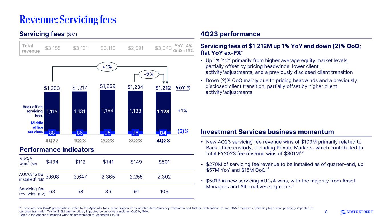 7 3Q23 4Q22 Equity & Bond Indices: EOP 11% 24% Daily Avg 0 16 EOP 10 15 Daily Avg (2) 12 EOP 7 7 Daily Avg (3) 5 EOP 11 20 Daily Avg (1) 14 EOP 8 6 Daily Avg (0) 2 Volatility Indices: EOP (29)% (43)% Daily Avg 2 (39) EOP 1 (24) Daily Avg (4) (31) EOP (6) (26) Daily Avg (7) (32) MSCI EM MSCI ACWI Bloomberg Global Agg VIX JPM G7 JPM EM (% change) 4Q23 vs S&P 500 MSCI EAFE AUC/A ($T, as of period-end) 2 Market indices9 • Up 14% YoY and 4% QoQ largely driven by higher quarter-end market levels and net new business • Up 19% YoY and 12% QoQ reflecting higher quarter-end market levels and net inflows AUM ($B, as of period-end) 2 +12% +4% $36.7 $40.0 $41.8 4Q22 3Q23 4Q23 4Q22 3Q23 4Q23 $3,481 $3,687 $4,128 +14% +19% A Line items may not sum to total due to rounding. Refer to the Appendix included with this presentation for endnotes 1 to 29. Select industry flows10 4Q22 3Q23 4Q23 Long Term Funds $(353) $(111) $(208) Money Market 148 132 168 ETF 193 110 265 North America Total (12) 131 225 EMEA Total 206 38 66 ($B) Total flowsA