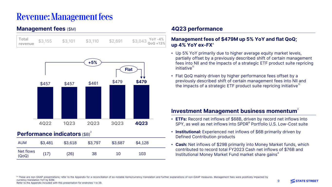 8 Servicing fees of $1,212M up 1% YoY and down (2)% QoQ; flat YoY ex-FXA • Up 1% YoY primarily from higher average equity market levels, partially offset by pricing headwinds, lower client activity/adjustments, and a previously disclosed client transition • Down (2)% QoQ mainly due to pricing headwinds and a previously disclosed client transition, partially offset by higher client activity/adjustments Servicing fees ($M) 4Q23 performance 1,115 1,131 1,164 1,138 1,128 88 4Q22 86 1Q23 95 2Q23 96 3Q23 84 4Q23 $1,203 $1,217 $1,259 $1,234 $1,212 $3,155 $3,101 $3,110 $2,691 $3,043 YoY -4% QoQ +13% Total revenue Investment Services business momentum • New 4Q23 servicing fee revenue wins of $103M primarily related to Back office custody, including Private Markets, which contributed to total FY2023 fee revenue wins of $301M1,2 • $270M of servicing fee revenue to be installed as of quarter-end, up $57M YoY and $15M QoQ1,2 • $501B in new servicing AUC/A wins, with the majority from Asset Managers and Alternatives segments2 A These are non-GAAP presentations; refer to the Appendix for a reconciliation of ex-notable items/currency translation and further explanations of non-GAAP measures. Servicing fees were positively impacted by currency translation YoY by $12M and negatively impacted by currency translation QoQ by $4M. Refer to the Appendix included with this presentation for endnotes 1 to 29. +1% -2% Back office servicing fees Middle office services +1% (5)% YoY % $434 $112 $141 $149 $501 3,608 3,647 2,365 2,255 2,302 63 68 39 91 103 Performance indicators AUC/A wins2 ($B) AUC/A to be installed2 ($B) Servicing fee rev. wins1 ($M)