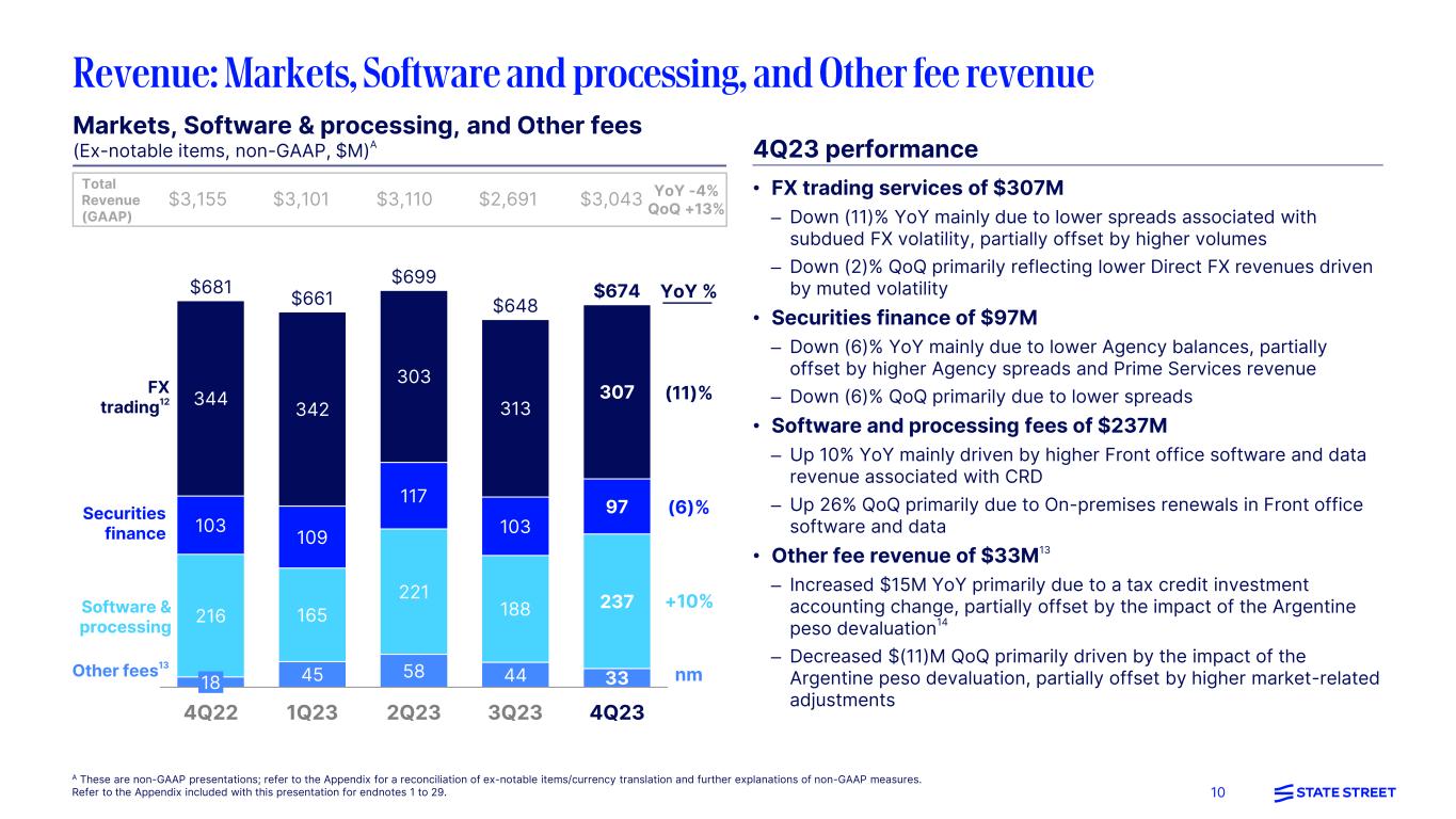 9 • ETFs: Record net inflows of $68B, driven by record net inflows into SPY, as well as net inflows into SPDR® Portfolio U.S. Low-Cost suite • Institutional: Experienced net inflows of $6B primarily driven by Defined Contribution products • Cash: Net inflows of $29B primarily into Money Market funds, which contributed to record total FY2023 Cash net inflows of $76B and Institutional Money Market Fund market share gains4 Management fees ($M) 4Q23 performance Management fees of $479M up 5% YoY and flat QoQ; up 4% YoY ex-FXA • Up 5% YoY primarily due to higher average equity market levels, partially offset by a previously described shift of certain management fees into NII and the impacts of a strategic ETF product suite repricing initiative11 • Flat QoQ mainly driven by higher performance fees offset by a previously described shift of certain management fees into NII and the impacts of a strategic ETF product suite repricing initiative11 Performance indicators ($B) 2 4Q22 1Q23 2Q23 3Q23 4Q23 $457 $457 $461 $479 $479 Investment Management business momentum2 Flat AUM $3,481 $3,618 $3,797 $3,687 $4,128 Net flows (QoQ) (17) (26) 38 10 103 A These are non-GAAP presentations; refer to the Appendix for a reconciliation of ex-notable items/currency translation and further explanations of non-GAAP measures. Management fees were positively impacted by currency translation YoY by $3M. Refer to the Appendix included with this presentation for endnotes 1 to 29. $3,155 $3,101 $3,110 $2,691 $3,043Total revenue YoY -4% QoQ +13% +5%
